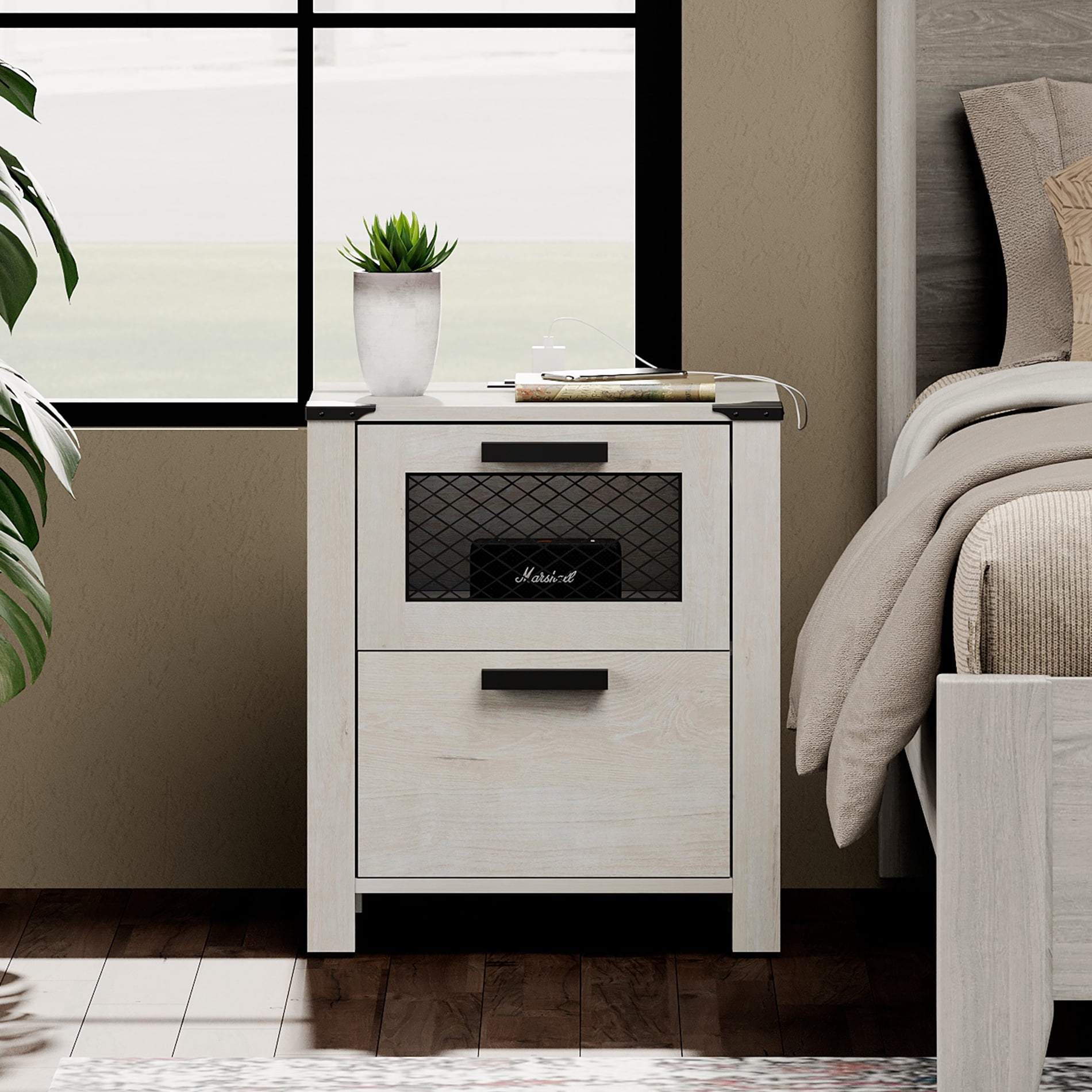 $104.92【Charging Function with USB Ports】Featured with 2 Standard Plug Outlets & 2 USB Ports, this side table is an ideal setup for charging your phones, lamps and other devices. Handy for your place as everything needed is within your arm’s reach. 【Retro Design for Universal Compatibility】Embracing a timeless retro aesthetic, the furniture piece seamlessly integrates into a broad spectrum of interior styles.The decorative metal corner and iron mesh elements, with vintage white wood grain, make this end table more industrial retro. 【Superior High Quality】Crafted from premium-grade MDF board , this exceptionally well-built furniture piece exemplifies superior quality and durability. The drawer operates on smooth, whisper-quiet glides, ensuring effortless opening and closing even when fully loaded, safe and durable. 【Ample Storage Capacity】The cabinet boasts a series of drawers, meticulously crafted to glide smoothly on robust metal runners, providing ample space for discreet organization of small items. The front of one drawer is adorned with the signature iron mesh, adding depth and texture while allowing a glimpse of the contents within, fostering a sense of curated display. 【Easy & Fast Assembly】A clear, step-by-step instruction manual accompanies the item, guiding users through each stage of assembly with concise text and intuitive illustrations.The installation of this product is a straight forward and enjoyable undertaking, thanks to its intuitive instructions, logically organized components, and ingeniously engineered design.