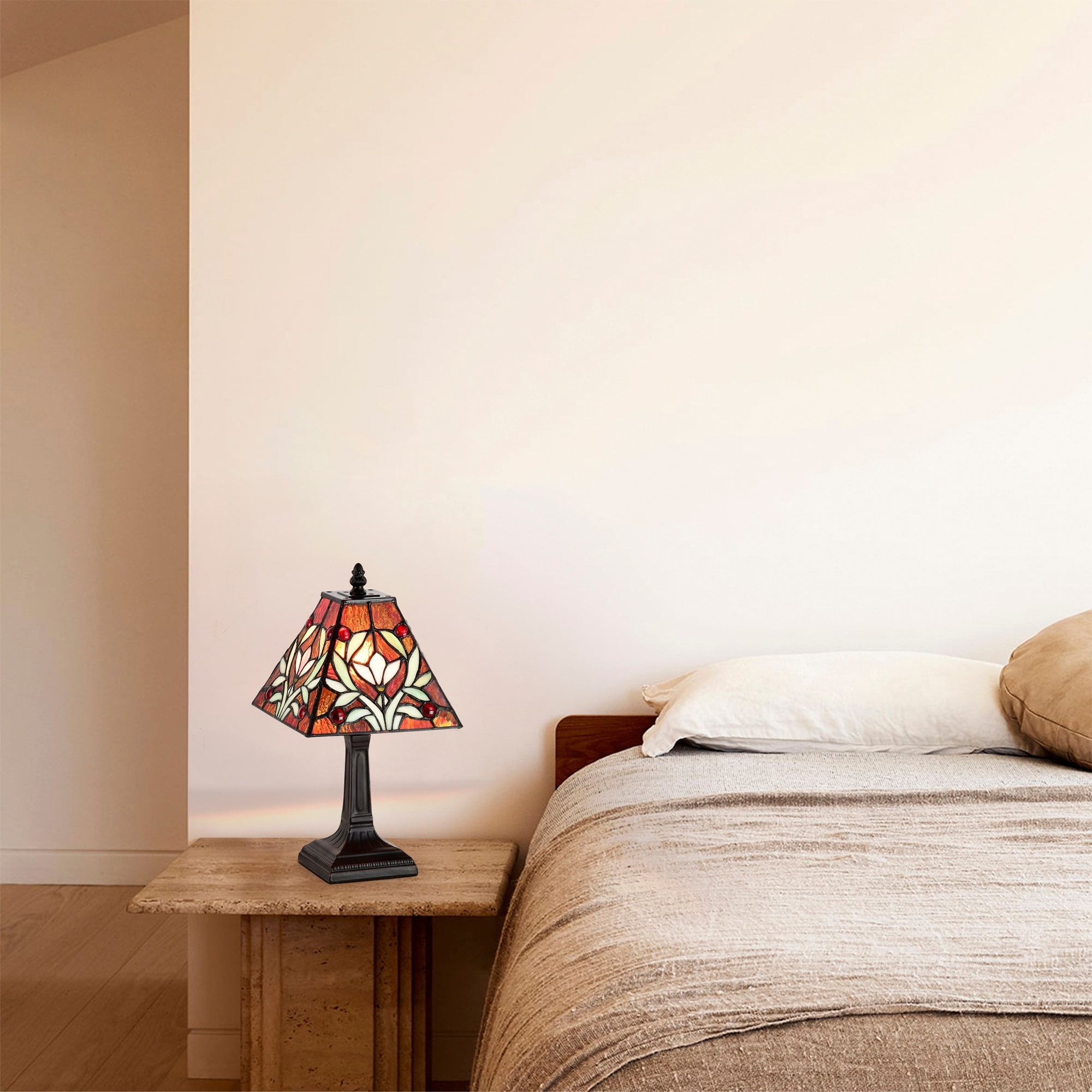$66.21Pretty flowers are hand-cut of stained glass and wrapped in fine copper foil to create this Warehouse of Tiffany 974#+SB114 Sophie Table Lamp. This Tiffany-style lamp was handcrafted using the same techniques developed by Louis Comfort Tiffany in the early 1900s. It requires one 60-watt bulb (not included).
