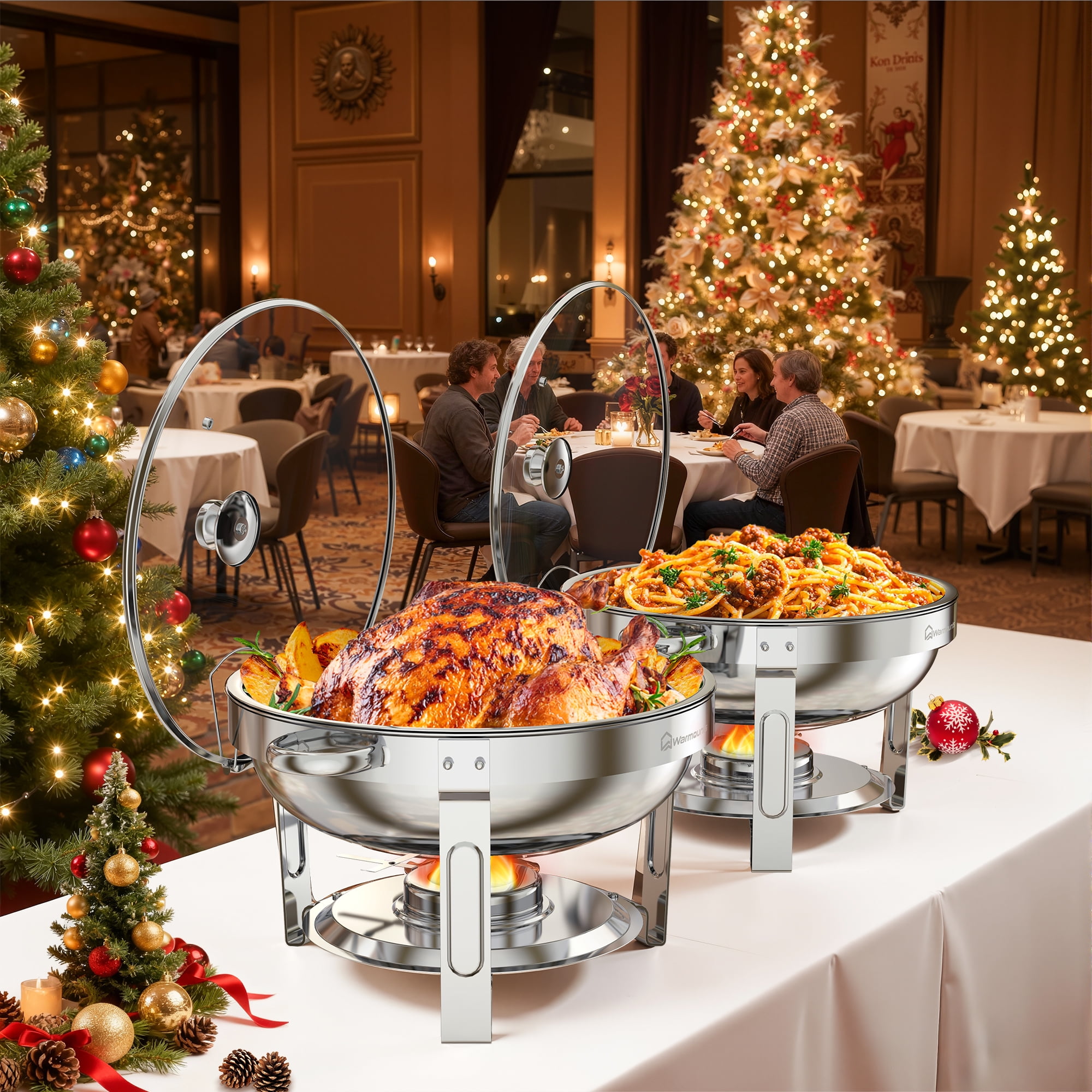 WARMOUNTS Round Chafing Dish Buffet Set 2 Pack, 5QT Buffet Chafe Warmer Set, Polished Stainless Steel Chafing Dish for Buffet with Glass Lid & Holder for Party Events, No Finger Cuts