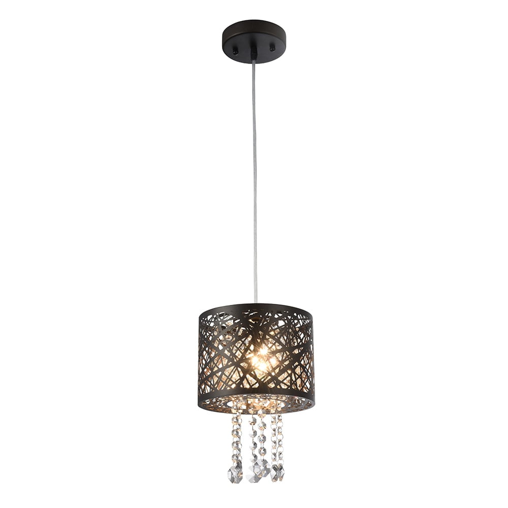 $52.45Add artistic flair and elegance to your favorite space. The mini drum with fun random metal strokes create a lovely cage like design. The high quality strands of crystals offer excellent reflective surfaces and sparkle. Lighting Finish: Antique Bronze Country of Origin: China Switch Type: Hardwired Bulb Wattage: 40 W Shade Material: Metal, Crystal Number of Lights: 1 Light Light Direction: Multi-directional Setting: Indoor Ceiling Light Fixture Type: Pendant Lighting Style: Traditional, Contemporary Exact Color: Bronze Finish: Bronze Finish, Antique Color: Brown