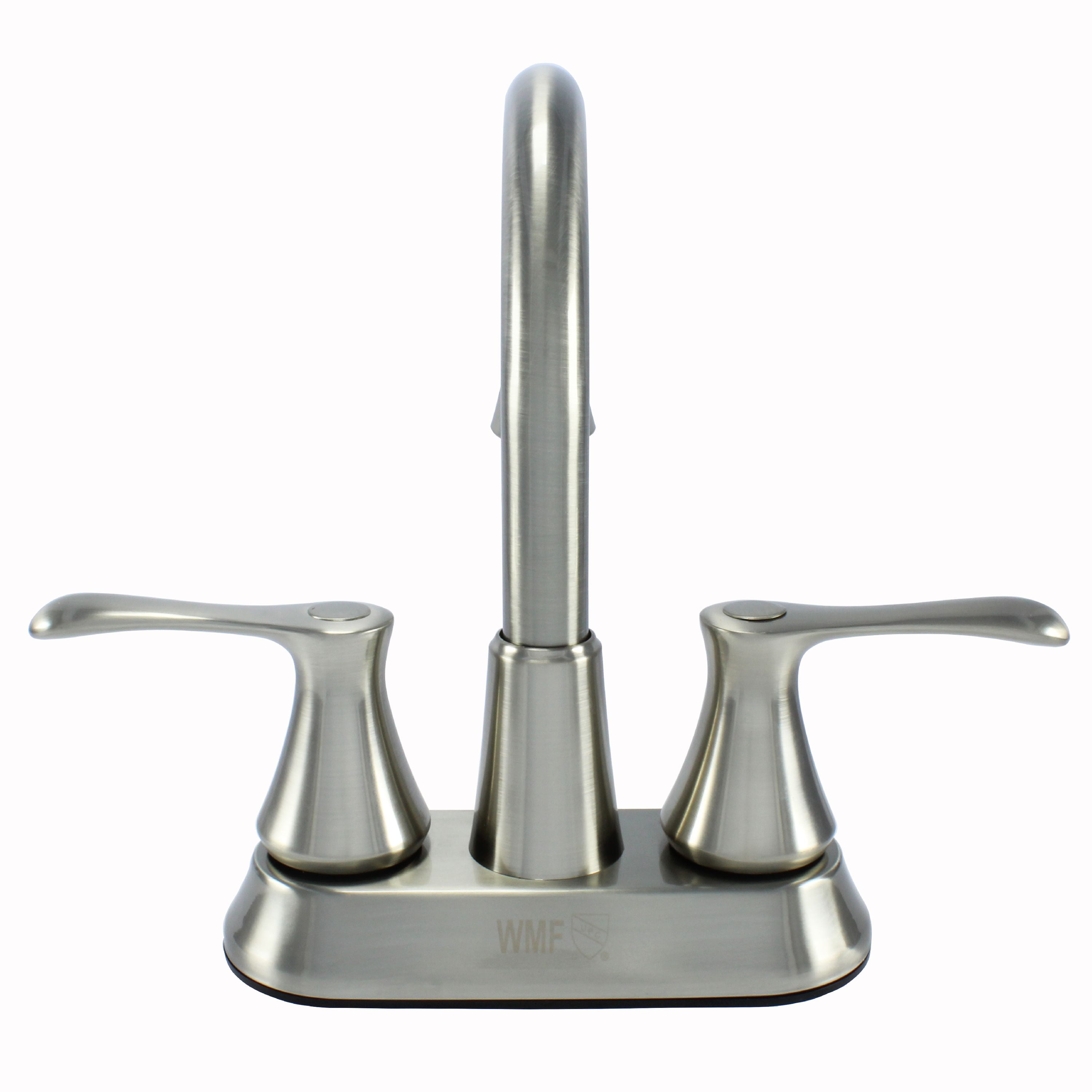 $42.49– 360 Degree Swivel Spout – High Arc Lavatory Faucet – High Quality Washerless Cartridges for Durability and Reliability – Wing Style Double Handle – Hybrid Metal Deck – Push Pop-up Included – Chrome Finish – 4″ on Center Installation – Flow Rate: 1.2 GPM – Standard 1/2″ IP faucet connection – Complies with ASME A112.18.1-2012/CSA B125.1-12 – Complies with NSF – Meets California low-lead AB1953 requirements – cUPC certification