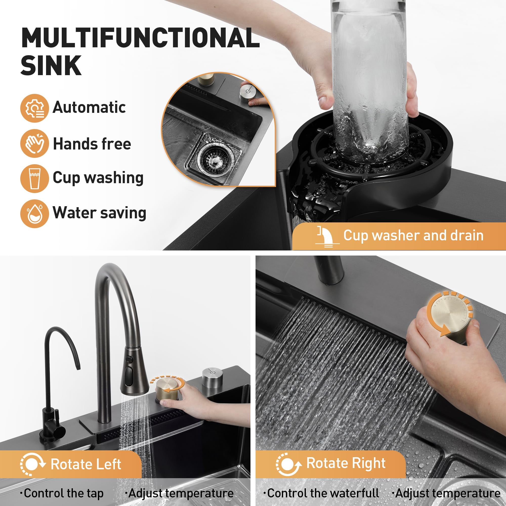 $171.99Waterfall Kitchen Sink, 304 Stainless Steel Waterfall Sink, Single Bowl Drop in Kitchen Sink, Kitchen Sink Workstation with Pull-Out Faucet and Multiple Accessories Brand: Color:Black Material:Stainless Steel Size:Large Product Dimensions:31.49″D x 18.11″W x 8.66″H Style:Contemporary Installation Type:Drop In, Countertop Finish Type:Brushed Shape:Triangular Drain Type:Pop-Up Item Weight:31.73 Pounds Product Care Instructions:Wipe with Dry Cloth Manufacturer: Item Weight:31.7 pounds Item model number:RG-KSK01 Finish:Brushed Included Components:Kitchen Sink Batteries Required?:No (31.5×18.1×8.7 inch) ✅Dual Adjustment:Rotate left to adjust for hot and cold water flowing from the faucet; rotate right to adjust for hot and cold water flowing from the waterfall. ✅Easy to Clean:Made of 304 stainless steel with nano-coating, non-stick oil stains, easy to clean. ✅Enough Space Under The Kitchen:Make full use of the space under the sink. You can place under the sink organizer, water filter or anything you want. ??Precautions for use: 1.Do not let soft iron, hard objects or rusty objects contact the sink for a long time. 2.Do not use strong acid and alkali to clean the items in the sink 3.Clean the sink and dry it after each use. Package include: Pulling Faucet Water Purifier Tap Hot and Cold Water Pipe A Cup Washer Control Launching Suit Hot and Cold Angle Valve Gourd Drainer Drain Basket Movable Basin Anvil Plate Warranty: 1-year warranty