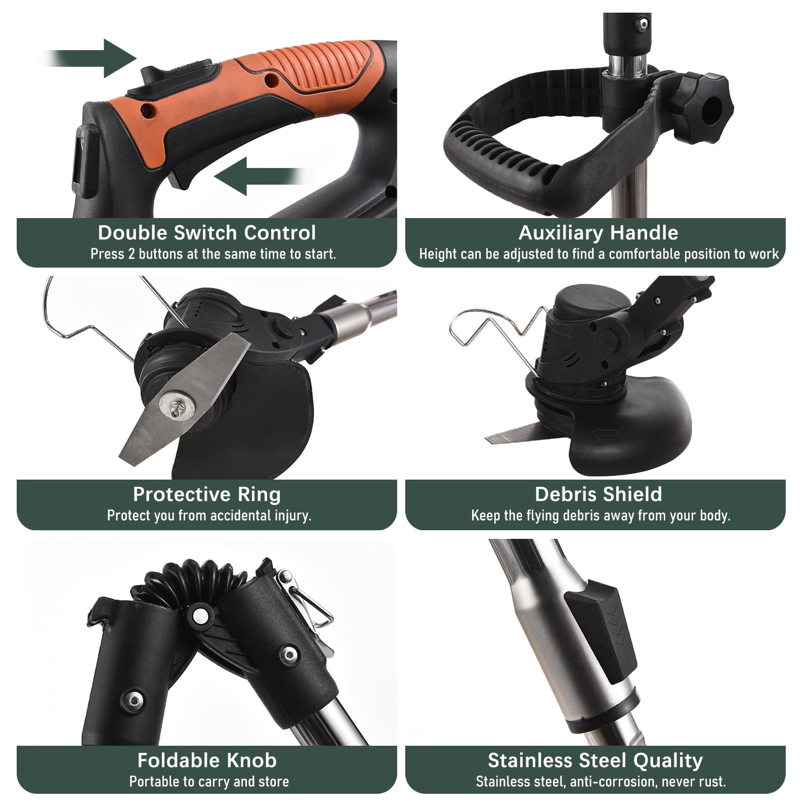 $68.79Original price was: $68.79.$34.38Current price is: $34.38.🍂This Cordless Grass String Trimmer is lightweight and portable, which is very easy to use. It can efficiently cut and trim weeds, branches and shrubs at high speed without loud noise, saving your time and effort. The extended handle makes it easy for you to saw even branches on trees; trimming weeds in water is also easy to operate. A great tool for cutting reeds, branches, weeds, etc. in fields, yards or gardens. 🍂Specification: Type: Weed Trimmer Material: Steel + Aluminum + Plastic Color: Green Plug: US Plug Battery: Lithium battery, 24 V, 2000mAh Power: 650W Cutting diameter: approx. 150mm/5.9inces Speed: 18000 RPM Unextended length: 920mm/36.3in Extended length: 1220mm/48in Weight: 1.2kg/2.65lbs Charging time: about 1 hour Using time: about 30 minutes 🎁Package Contents: 1*Grass Trimmer 2*Lithium Batteries 1*Charger 1*Plastic Handle 5*Plastic Blades 1*6” Blade 2*Boat-shaped Blades 1*Anti-collision Steel Ring 1*Grass retaining board 1*Wrench Socket 1*Manual 🍂Weed & Brush Cutter 2-in-1: Comes with 5 plastic blades for weed cutting, mowing and trimming without damaging the lawn but providing neat turf. You can trim edges on sloping terrain and reach hard-to-reach places with this trimmer. Made of high-quality materials, it is durable with high power. 🍂Telescopic Pole: The pole is designed with a button for easily and conveniently adjusting length from 92cm to 122cm to fit user’s height and posture. 🍂Adjustable Working Angle: There is a button that you can adjust the head angle according to your requirements by pressing it. High quality miniature textured grip gives you maximum comfort during use.
