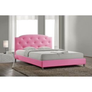 $365.49Baxton Studio Carlotta White Modern Bed with Upholstered Headboard – Full Size Clean, crisp, and contemporary is the Carlotta Designer Bed frame. Soft white faux leather outfits a scallop-cornered headboard with matching upholstered side rails and low footboard, making this a sleek style for sleeping. Malaysian-made, the full sized Carlotta Contemporary Bed features an inner frame of hardwood and plywood, which are padded with foam before being upholstered. Faux crystals stud the headboard, creating a trendy button tufted look. This is a platform bed: wooden slats (included) serve as a box spring so only a mattress and bed linens are needed (mattress and linens are not included). Tying everything together are silver metal legs with non-marking feet. Easily maintain the Carlotta Bed by wiping clean with a damp cloth as needed. This style requires assembly and is offered in black (full, queen, and king size) or white (full, queen, and king size); each sold separately. Specifications: Contemporary full size platform bed (slats included) White faux leather Hardwood and plywood inner frame Silver metal legs with non-marking feet Faux crystal button tufted headboard Assembly required