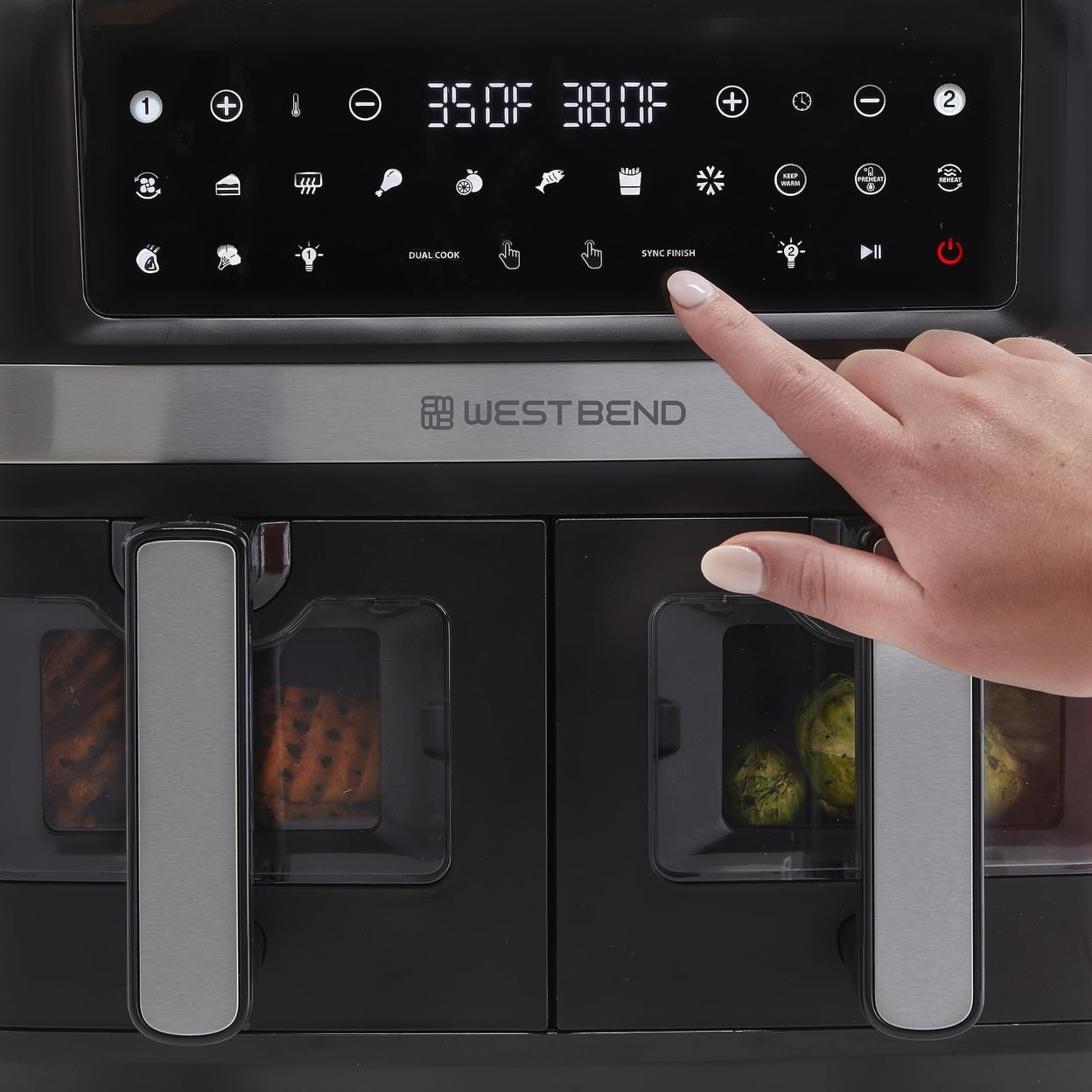 $128.99Original price was: $128.99.$114.38Current price is: $114.38.Discover a quick and easy way to cook delicious, healthier meals with the West Bend 10 Qt. Double UP™ Air Fryer. Whether you want to make two baskets of delicious fries or cook two foods two ways for a complete meal, this extra large dual basket air fryer eliminates back-to-back cooking and helps save time. Cook your favorite foods to crispy perfection with 15 one-touch preset functions (Air Fry, Bake, Broil, Chicken, Dehydrate, Fish, Fries, Frozen, Keep Warm, Preheat, Roast, Reheat, Dual Cook, Sync Finish, Vegetables). Double up on your favorites with dual cook. Simply set one basket and easily mirror the settings on the other basket by pressing dual cook. Cook two meals, two ways and have them done at the same time with sync finish. The touchscreen LED digital interface is easy to read and access while you’re cooking. The baskets feature an easy-view clear window so you can watch as your favorite recipe is cooked to perfection. The frying baskets also feature our strong, PTFE-free Diamond Shield™ infused coating, providing scratch-resistant durability and preventing foods from sticking for easy cleanup. The easy-to-grip, ergonomic handles are cool to the touch. This dual air fryer fits on your countertop, and the sleek look complements any kitchen décor. Covered by the West Bend 12-Month Limited Warranty.