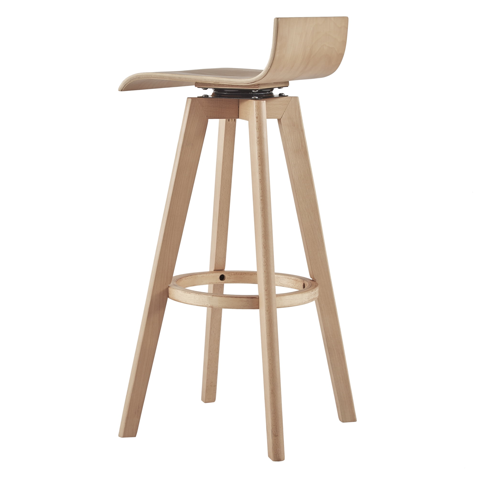 $132.78With its modern curves and unique shape, these wood finish bar height stools offer eye-catching style for your casual dining space. A slightly curved seat and low-profile back allow plenty of room for this modernized stool, while thin, sleek legs and a circular footrest add comfort and a sophisticated look to your home. The swivel functionality of each bar stool provides improved mobility and ease to everyday conversation throughout casual meals. Choose between a natural or walnut finish to display an earthy vibe that pairs well with almost any setting.