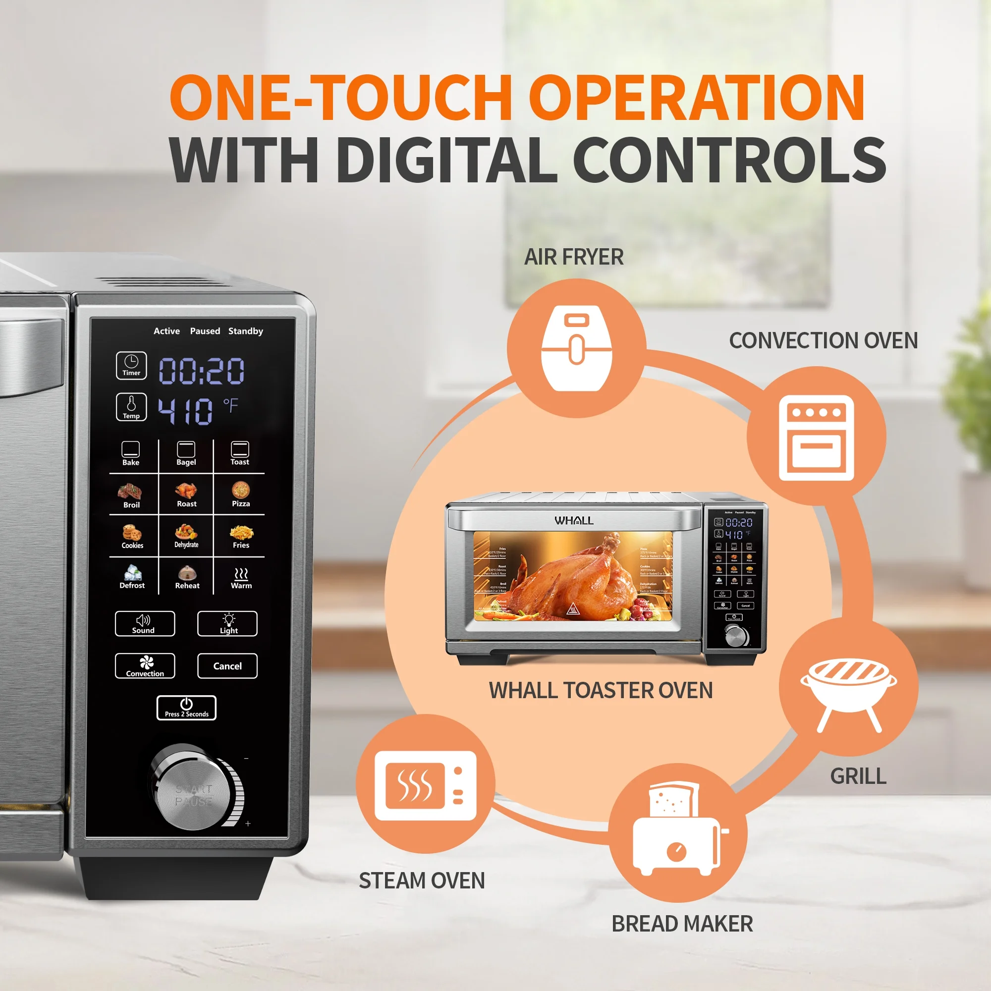 $214.99WHALL Air Fryer Oven, Max XL Large 30-Quart Smart Convection Oven,11-in-1 Toaster Oven with Steam Function,12-inch Pizza,6 slices of Toast, 4 Accessories Included, Stainless Steel /1700W Featuring 12 preset menus, this toaster oven offers a wide range of cooking options to suit your every need. From baking and toasting to grilling and roasting, this appliance has got you covered. The circulating convection design ensures that your food is cooked faster and more evenly. Designed with your convenience in mind, this toaster oven is equipped with a smart touchscreen interface for easy operation. Crafted with high-quality stainless steel, this toaster oven not only adds a touch of elegance to your kitchen but also offers durability and easy maintenance. The auto shut-off feature provides safety and peace of mind, while the cool-touch handle ensures safety during use. Key Features 1. Extra Large 30QT Capacity 2. 11 Preset Menus 3. Circulating Convection Design 4. Air Fryer Function 5. Steam Function 6. Smart Touchscreen 7. Sleek Stainless Steel 8. Auto Shut-off & Cool-Touch Handle Specifications Material: Stainless Steel Item Size: 22.7 x 18.1 x 14.3 In Item Weight: 25.4 Lbs. Rating Voltage: 120V~ 60Hz Rating Power: 1700W Item Condition: New Note Before first use, preheat the toaster according to the tips in the manual. Warranty & Service Our products come with one-year-free warranty. If any issues, please contact our customer service team, we will reply you within 24 hours.