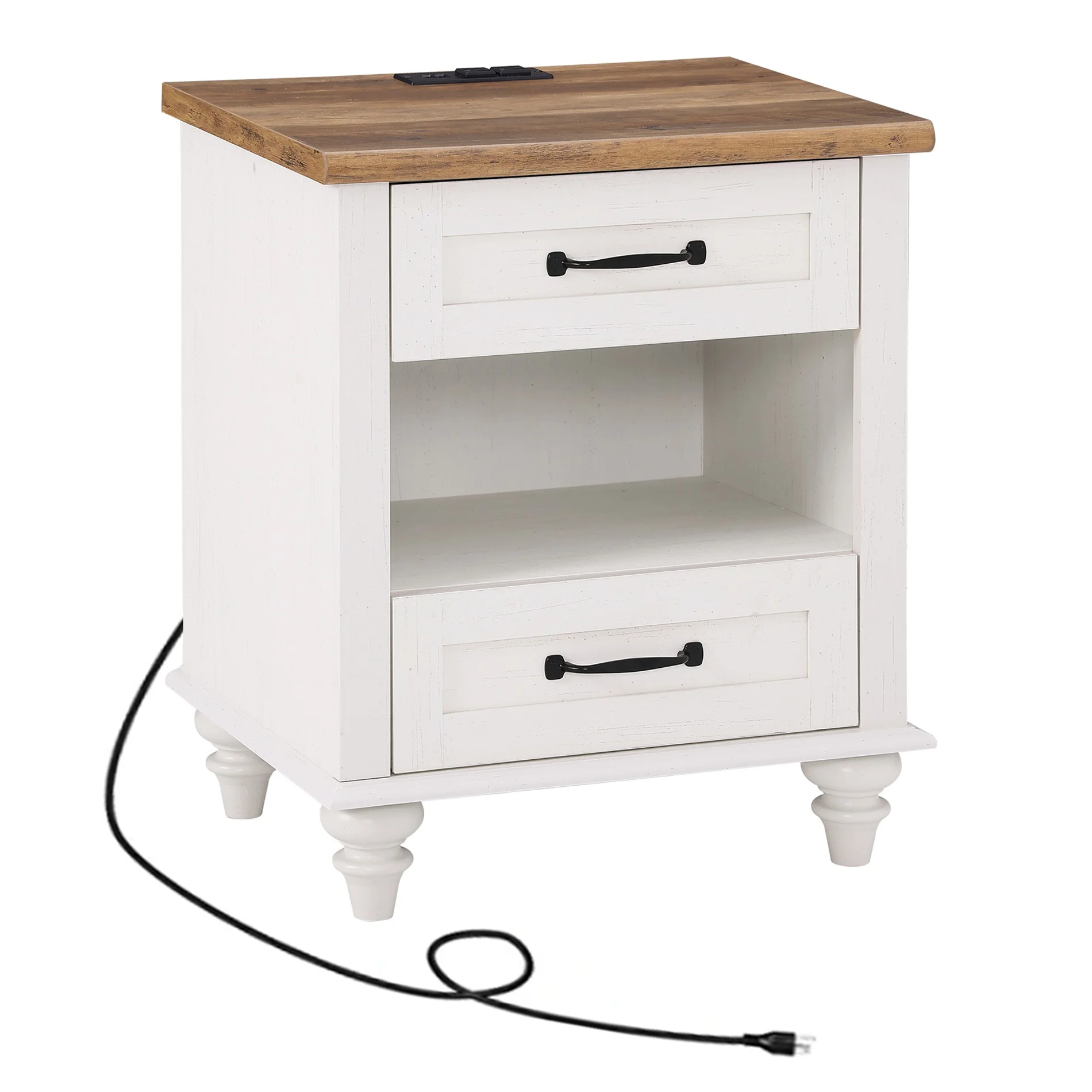 White Nightstand with Charging Station for Bedroom, Wood End Table for Living Room Kids room