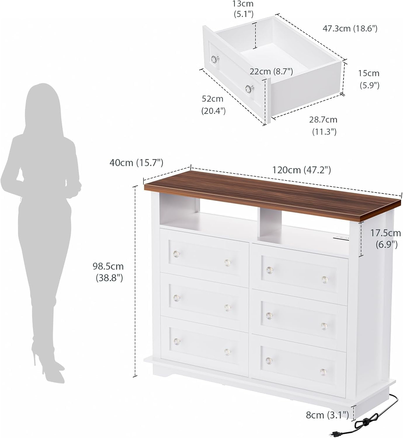 White Dresser with LED Lights, 6 Drawer Dresser with Power Outlet for Bedroom