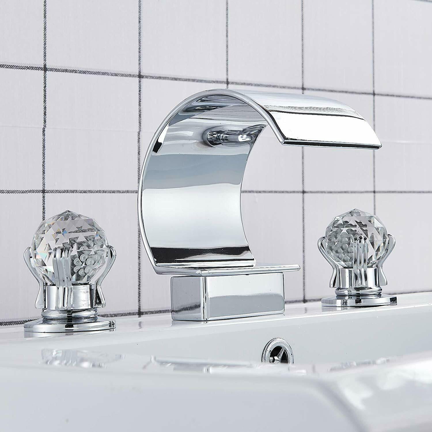 $36.11This Bathroom Sink Faucet 3 Hole 2 Handle Crystal Knobs High Arc Waterfall Spout Vanity Basin Mixer Tap 8-inch Upwards Widespread Bathtub Filler Faucet.The unique arc waterfall spout design provides a clear and steady laminar stream,compared with other basin faucet,which can leave a wider basin space for cleaning, user- friendly bathroom design.The waterfall bathroom basin faucet can also add a sense of sleek to your bathroom washbasin.Easy control hot and cold,two handle installation are good for effortless flow and water temperature control. The body of the waterfall bathroom faucet is made of solid brass .The drip free ceramic disc cartridge can withstand multiple opening and closing tests, and Long Lasting Operation.Featured in the sturdy foundation and eye-catching sophistication, this widespread sink faucet will add highlights to your bathroom decor.