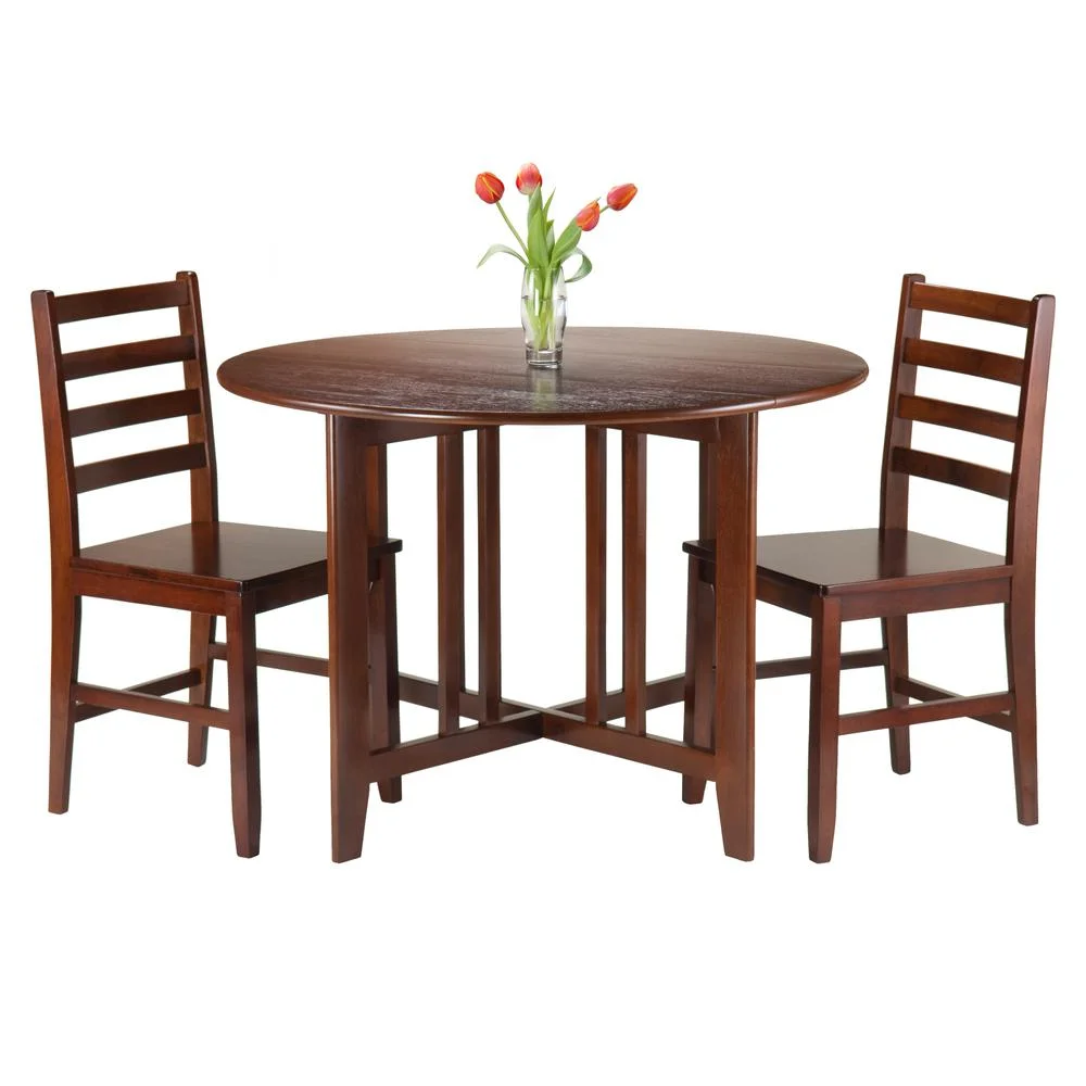 $226.50Bring comfortable hospitality home with the Winsome Trading Alamo 3 Piece Round Dining Table Set with Hamilton Ladder Back Chairs. Perfect for your sun room or cozy eat-in kitchen, this set includes two chairs and a table with two drop leaves. When not needed, fold down the leaves and this round table becomes a space-saving cutie. Open it to the full 42 inches around when you have more guests. The two chairs feature a traditional ladder back design that adds a casual country farmhouse feel to the set. They’re also comfortable and include stretchers for added stability. This three-piece dining table and chair set is constructed to withstand the rigors of daily life beautifully. Pieces are crafted of a combination of solid and composite wood for durability. The warm antique walnut finish is a natural addition to your classic or contemporary home. Some assembly is required. Product Dimensions: Extended table: 42W x 27.80 x 29.65H in. Folded table: 42W x 13.84D x 29.65H in. Drop leaf (2): 42W x 14.87D in. Chairs (2): 16.54W x 18.63D x 34.70H in. Seat: 16.54W x 16.46D x 18H in. Seat back: 16.60W x 17.06H in.