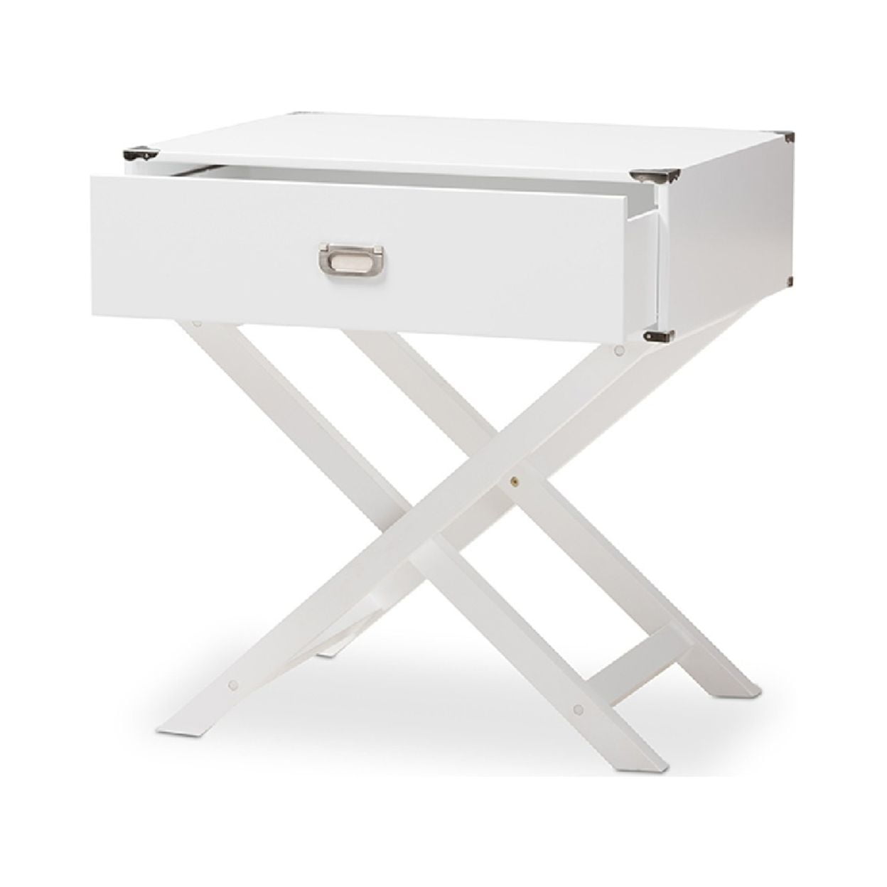 $126.28Original price was: $126.28.$103.70Current price is: $103.70.Baxton Studio Curtice Modern And Contemporary White 1-Drawer Wooden Bedside Table Display your novels in style by your bed and within reach by showcasing the wonderful Curtice bedside table. High-density medium density board base for a sturdy and durable quality with a white paint finish for smooth, resilient style. Design features one drawer with a fixed x- base for a lamp, books and bedroom articles. Metal brackets and handle pulls complete the look of a modern and contemporary style. Made in China, the Curtice nightstand requires assembly.