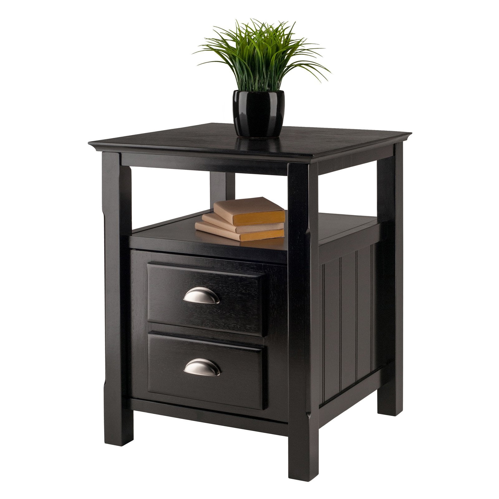 $103.91Original price was: $103.91.$81.28Current price is: $81.28.The Winsome Timber Nightstand is a classic versatile piece of furniture that provides accentual contemporary storage to your bedroom with a nice clean design. It?s simple black finish makes it easy to compliment almost any decor all while the brushed aluminum door pulls offer a striking contrast of elegance. The headboard-inspired side panels and sculpted square legs help accentuate the look. This table features a drawer and a shelf. So, whether it?s in your bedroom with a lamp on top or in any other room of your home with family photos, you?ll have a place for your books, pens, or easy access accessories. For larger rooms, complete the look with a table on each end and other items from the Winsome Timber collection (each sold separately). Conveniently packed and shipped in 1 box and ready to assemble.