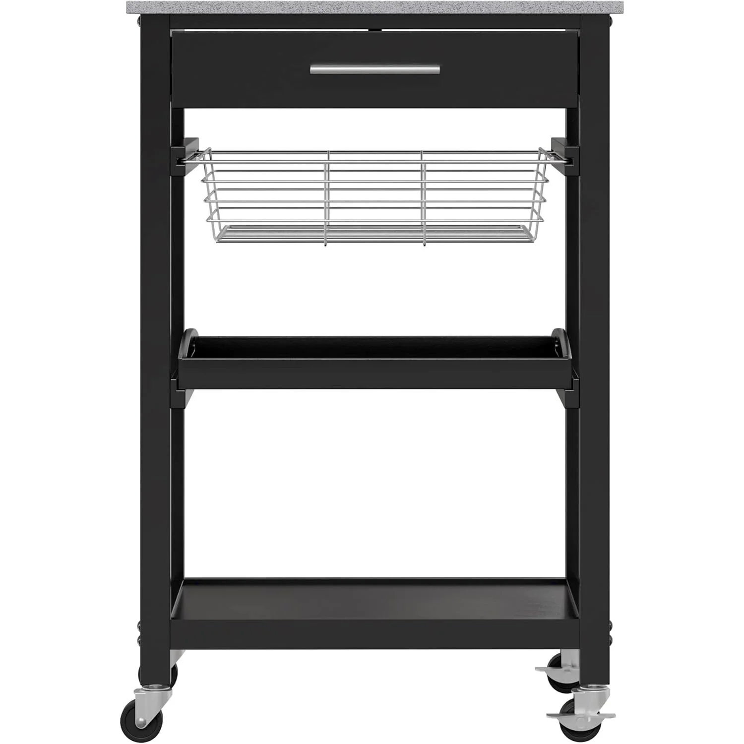 $105.07Original price was: $105.07.$80.02Current price is: $80.02.Add a modern, functional touch to your kitchen with the Winsome Wood Julia Kitchen Cart. A granite top that brings a lovely contrast to the clean, modern, black-finished cart constructed of composite wood. A compact size with versatility for small kitchens that need storage and additional countertop that provides an easy-to-clean prep station. A drawer with a nickel finished handle provides space for silverware, knives, and accessories. Keep serve-ware or mixing bowls handy on the bottom shelf. A wire basket sits below the drawer and is perfect for having fruit readily available. The center serving tray is removeable and with cut-out handles on each end, ideal for serving snacks to kids or guests. The four casters allow for easy mobility, roll out to the dining area, and use as a serving cart. Two of the casters lock to help keep the unit stable while in use. Conveniently packed and shipped in 1 box that includes the hardware necessary for assembling.