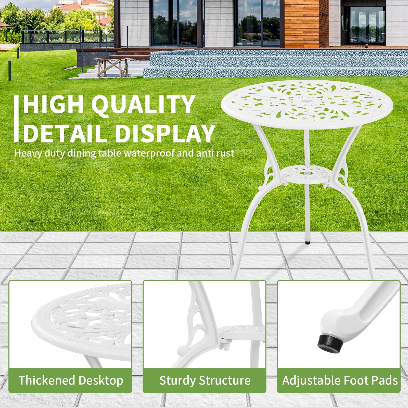 $142.753 pieces outdoor bistro set includes a round table and 2 chairs for the perfect setting. As an extension of home, this bistro table can hold an outdoor umbrella with umbrella holes, protecting you from the wind and rain, and making it perfect for dining and enjoying a few cups of coffee. The entire frame of bistro table and chairs is made of all weather cast aluminum material for durability and long life. The ergonomic chair design relaxes your whole body and brings the most comfortable experience to enjoy this leisure time. Complete installation manual and toolkit will help you to assemble it easily without any difficulties. This attractive bistro table set is coated with a rust and fade resistant powder coating that is sure to maintain its beauty whether you place it by the pool, lawn, garden, patio, backyard, etc.