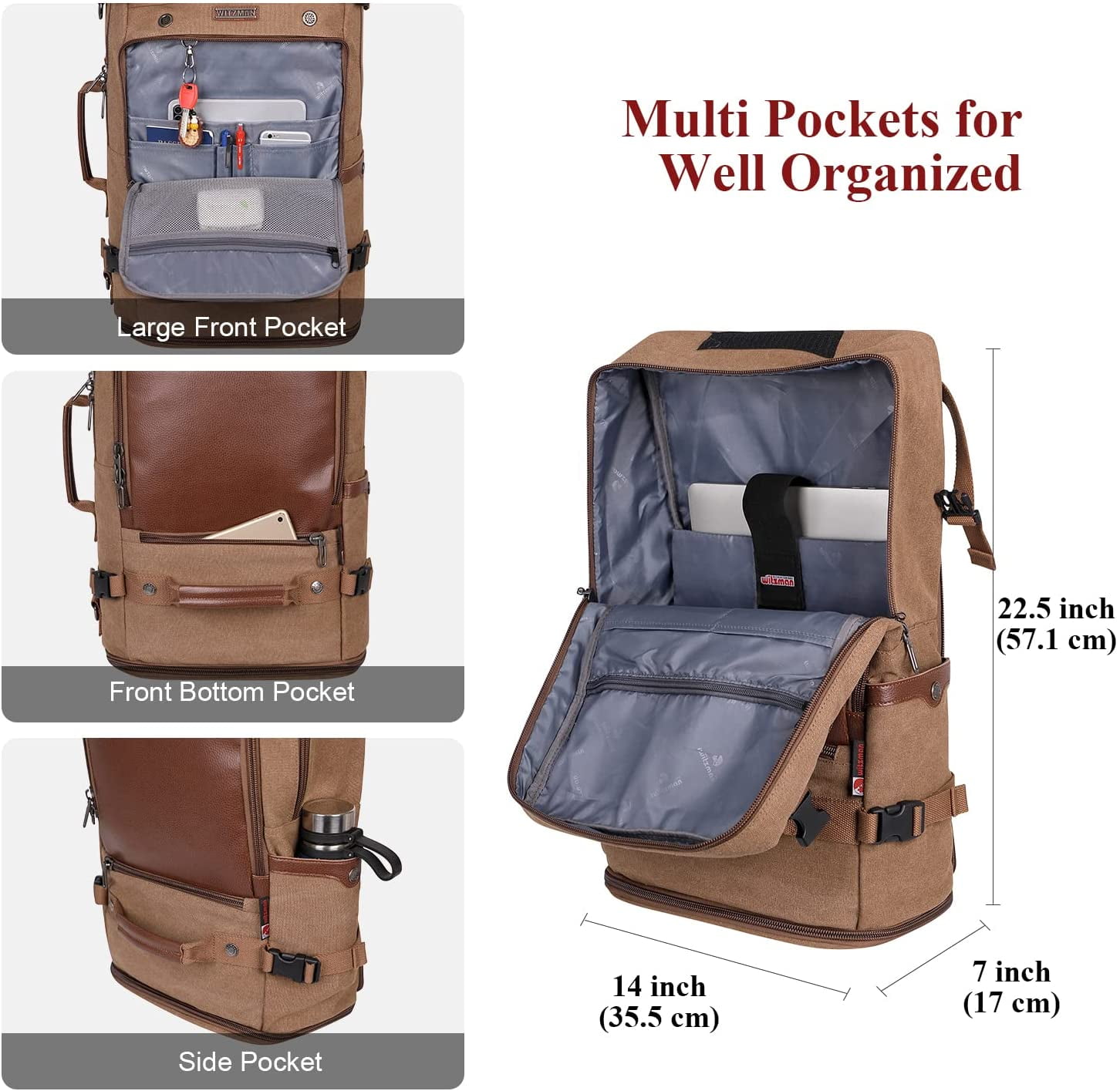 WITZMAN Large Travel Backpack for Men Canvas Rucksack Carry on Luggage Duffel Bag (A2021 Update Brown)