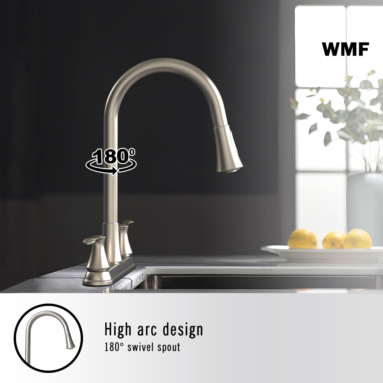WMF-8235GNZMLP-BN – Hybrid Metal Deck Kitchen Sink Faucet, 360 Degree Swivel, High Spout, Double Handle with Side Spray