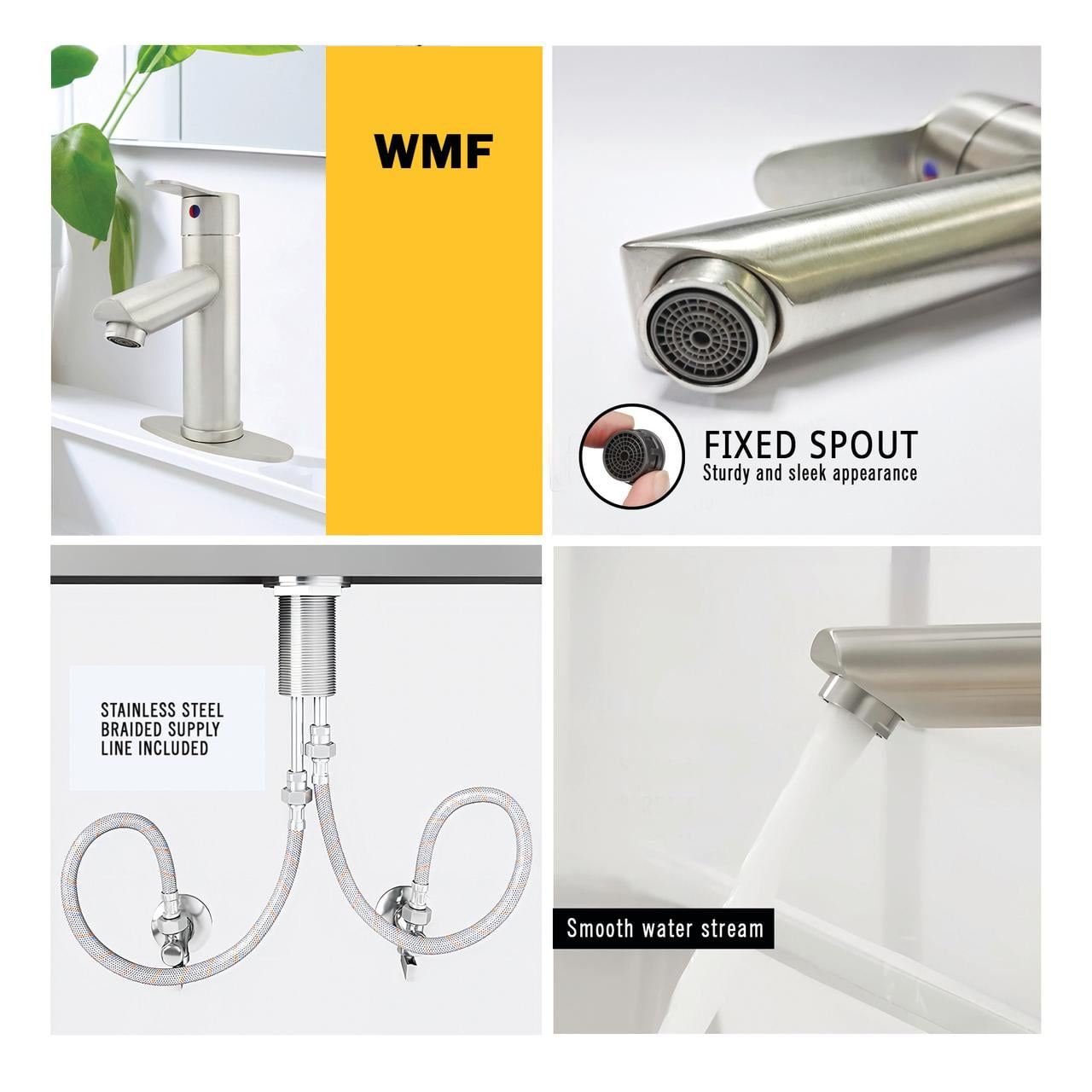 $34.83Stable single-handle for quick and exact control over temperature and stream strength. Spout produces a powerful water flow for washing hands or filling the sink. DESIGN – This single handle faucet comes with modern design, using premium material construction is ideal for updating your sink hardware. QUALITY – High Quality Ceramic Cartridges for Durability and Reliability. Brushed nickel finish to avoid corrosion and tarnishing INSTALLATION – This single hole faucet can be installed with or without the deck plate depending on your visual desire. No need plumber for install, you can install this faucet easily and quickly.