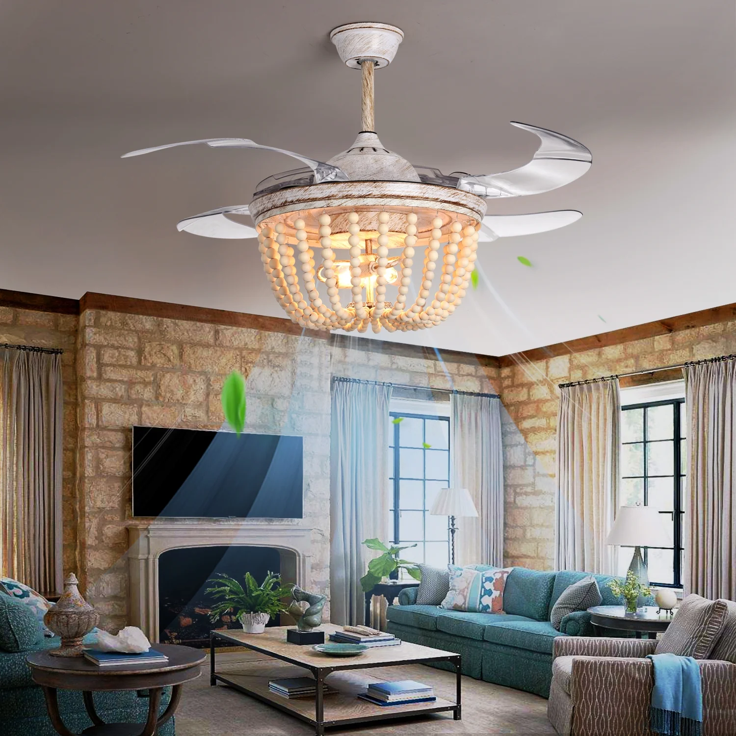 $85.99Wood Bead Ceiling Fan with Lights, Boho Chandelier, Reverse Retractable Blades, 42 inch 6-Gear Speed, Remote Control, Timing Function, For Kitchen, Living room, Bedroom (Bulb Not Included). Boho Wood Bead Design-This low profile ceiling fan with lights decorates your room with classic bohemia style elements.