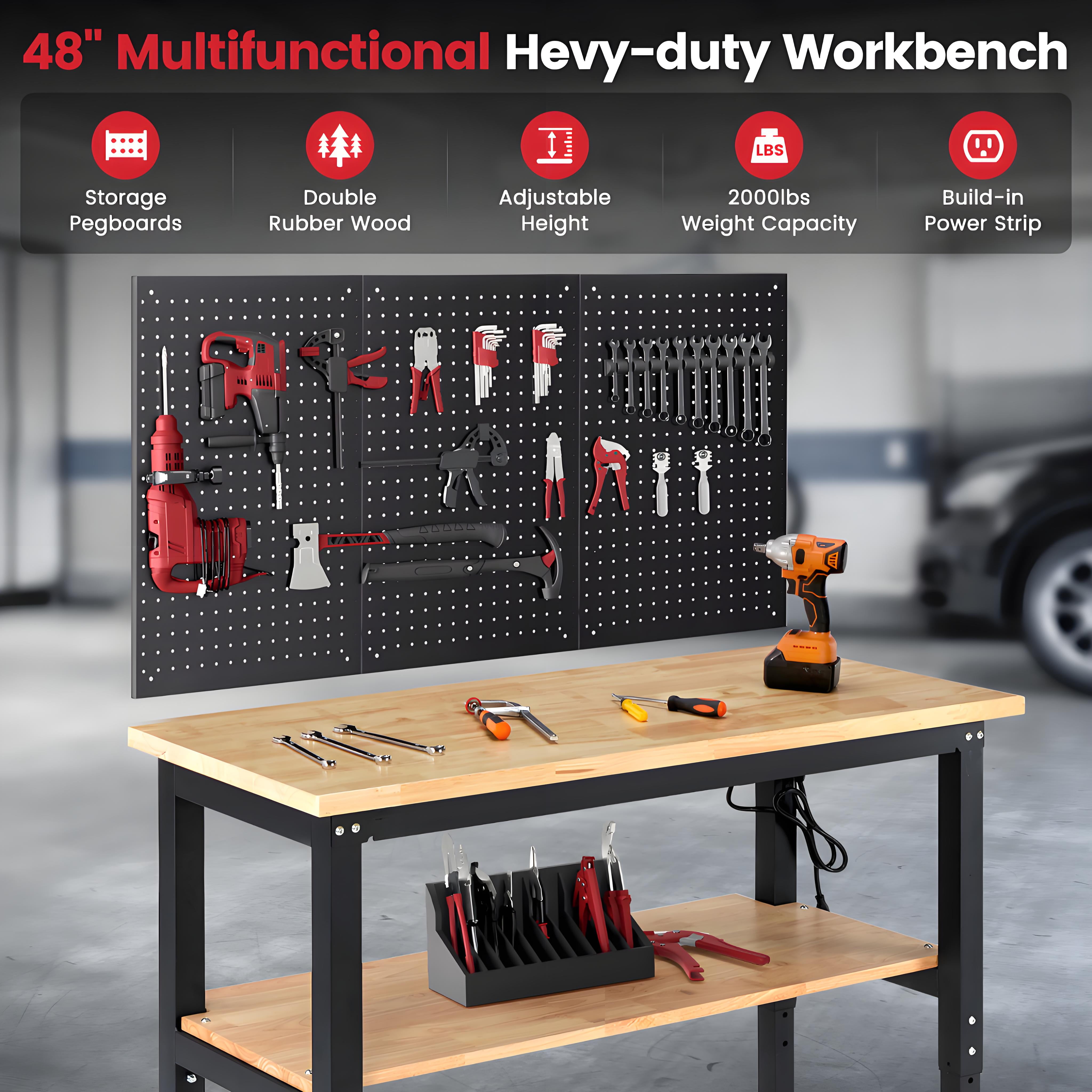 Workbench for Garage,ENJOYWOOD Heavy-Duty 48 inch 2 Tier Wood Work Bench with Storage Pegboards,Rubber Mat,Power Outlets, Rubber Wood Tabletop 2000 LBS Load Bearing Workstation Garage Desk Work Table