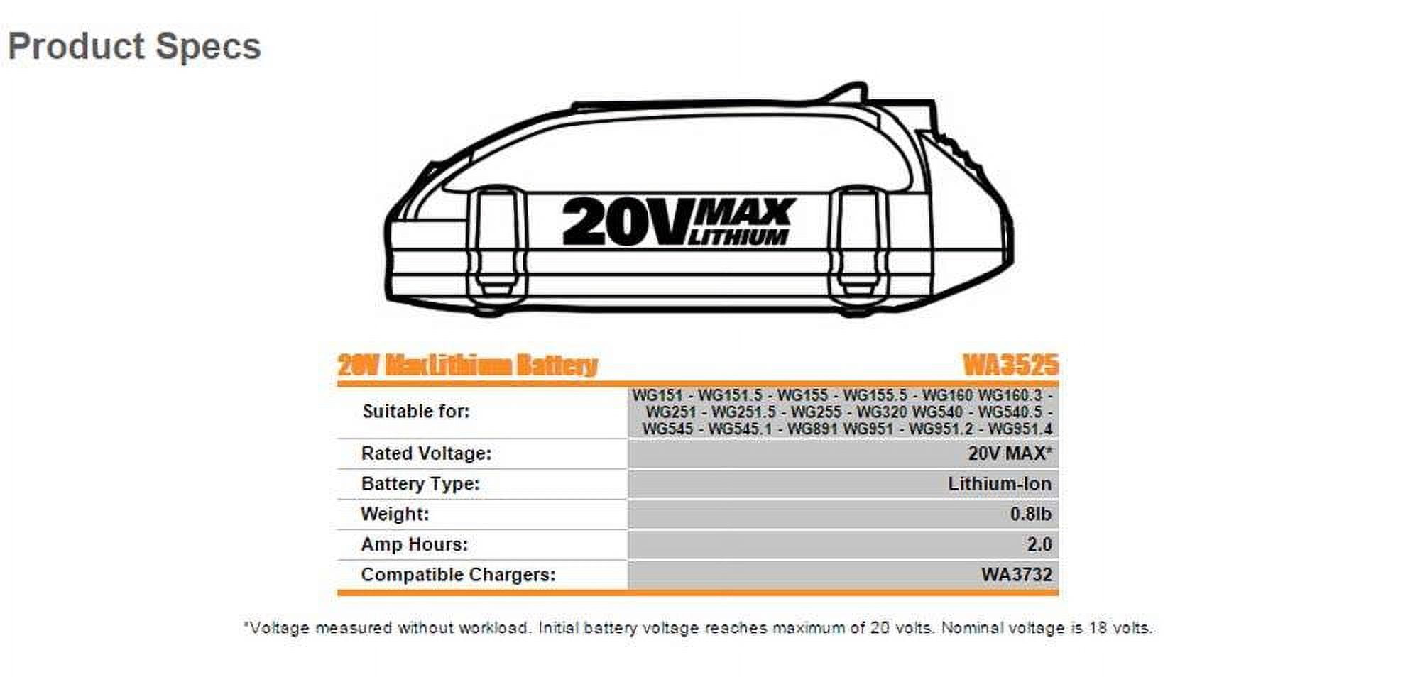 $51.59The battery that runs an entire family of power and lawn & garden tools, the Worx 20V Power Share 2.0 Ah battery. It runs your cordless 20V & 18V Worx tools, and even pitches in to help power the 40V & 80V tools on the platform, too. (You’ll need two 20V batteries total for the 40V tools, and four batteries for the 80V tools.) It charges in about 5 hours, but you can get the 20V Quick Charger and fill it back up in about an hour (charger not included). It’s full of MaxLithium tech which makes it much more efficient than the older style of rechargeable batteries that would quickly lose the ability to hold a full charge. So you’ll be able to power drills and circular saws, leaf blowers and grass trimmers, Hydroshots and lawnmowers, over and over and over. It lasts longer than the previous 1.5 Ah model, so you can work longer before needing a recharge or swapping out to another battery. This WA3525 2.0Ah 20V Power Share battery makes a great addition to any existing Worx cordless tool collection. Extra batteries are always nice to have. It’s also an excellent way to start a tool collection with a cordless Worx tool that doesn’t come with a battery. Whichever it is, you’ll be pleased with this power-packed efficient little source of rechargeable energy. Get one and get to work!