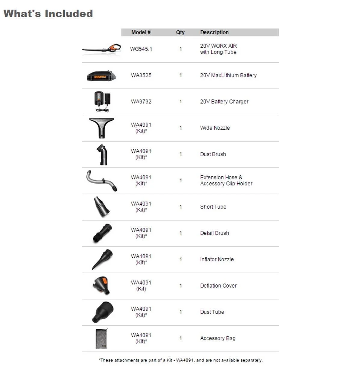 $111.79Original price was: $111.79.$100.05Current price is: $100.05.The WORXAIR is a multi purpose blower and sweeper with convenient attachments to create a clean zone around the entry points to your home. Did you know, 85 percent of the dirt in your home is tracked, blown or carried in from entry points like your garage, deck, porch or workshop. With the WORXAIR, clean up is easier and faster when you don’t have to move a single thing. The 20 volt MAX Lithium battery gives you cordless clean up without any smelly exhaust or tangled cords. The WORXAIR has all kinds of attachments for cleaning, clearing, sweeping, dusting, inflating, deflating and even drying all sorts of things around your home. It is an ultra fast cleaning system. Create that clean zone around your home with a flexible tube and a variety of nozzles designed to reach tight spaces for detailed clearing and cleaning of debris. Use the inflator nozzle to blow up mattresses and pool toys. The WORXAIR even comes with a deflator cone to quickly and easily deflate those bulky inflatable’s in the home, for the RV or boat. Outside the home, the dust brush is excellent for clearing spider webs, cleaning window sills from pollen and dirt and sweeping sills. The wide nozzle creates a wide airflow for drying flat surfaces or sweeping wider areas. Also, the WORXAIR is a great auto detailing companion. Use it to dry wheels and tires and even your entire car. Create and maintain a clean zone around your home Cordless convenience with the powerful 20 volt MAX lithium battery Ultra lightweight and compact to fit and go anywhere Includes 8 attachments for an array of clean up or inflating tasks 120 mph air speed with 80 cfm air flow and only 3.5 lbs.