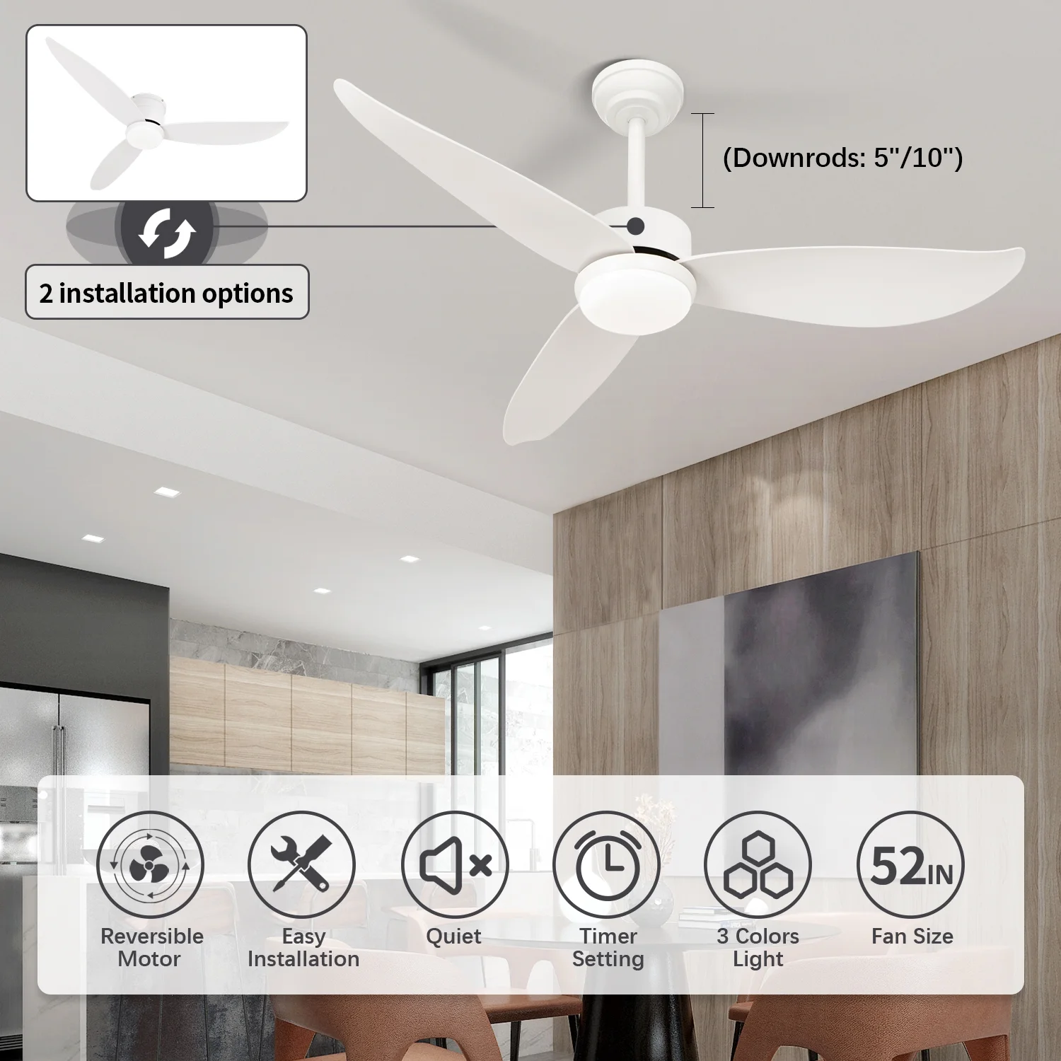 WOZZIO 52” White Ceiling Fan with Light and Remote Control, 2 Options Installations, 3 ABS Fan Blades, Home