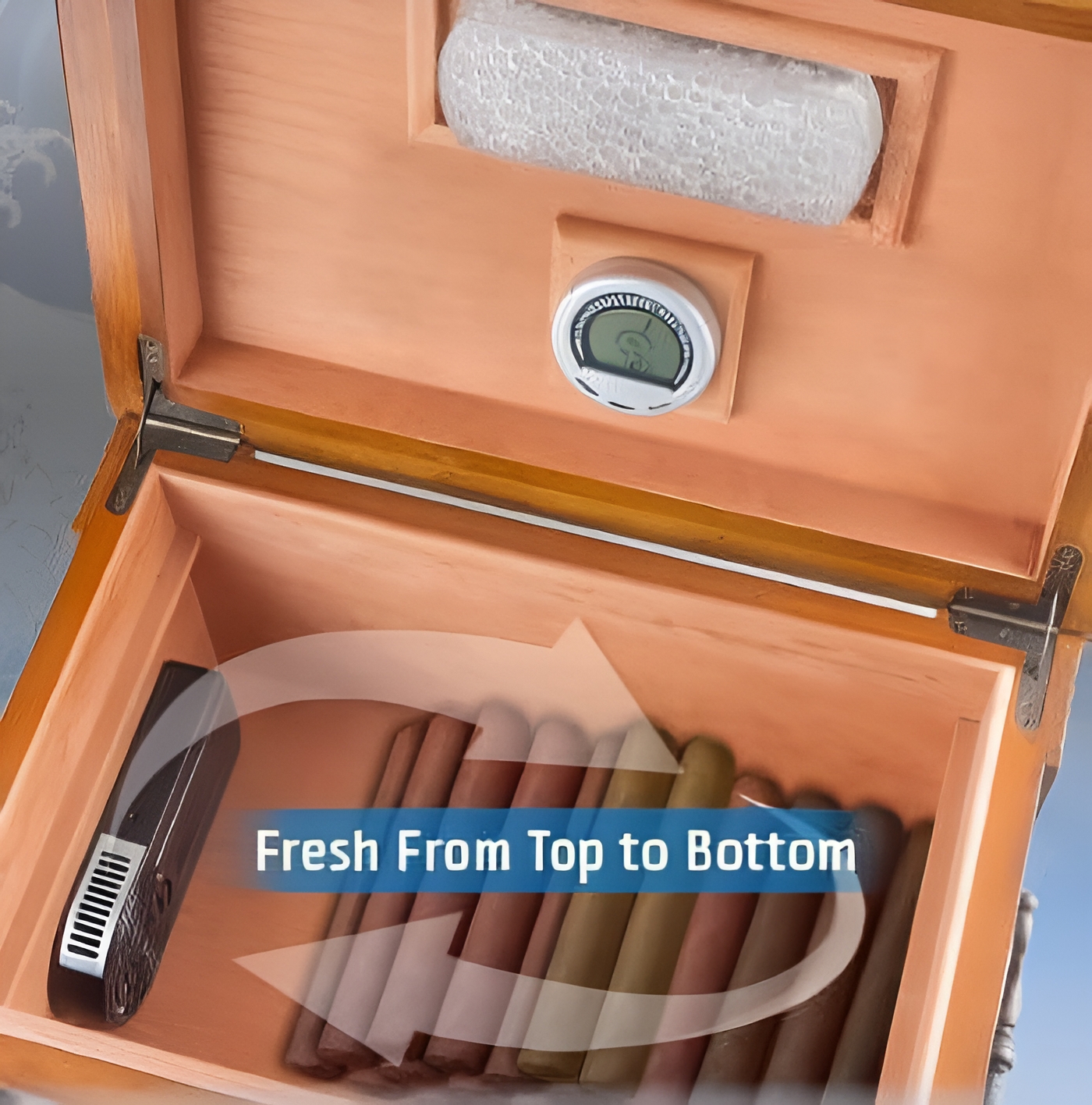 $44.65fan runs in 15 second cycles every 15 minutes angled centrifugal fan maximizes air circulation oversized side intake for maximum air redistribution LED battery status indicator batteries included (four AA batteries) Dimensions: 5.9″W x 2.95″H x 0.98″D Under normal conditions, higher humidity levels rise and settle toward the top of your humidor. The Humi Fan provides intermittent air circulation to prevent stagnant conditions inside your humidor, allowing your cigars to “breathe” by redistributing the air inside your humidor to diffuse inconsistent humidity levels, providing a more consistent and stable environment for your cigars. The Humi Fan is designed to work with cigars resting directly against the intake of the unit.