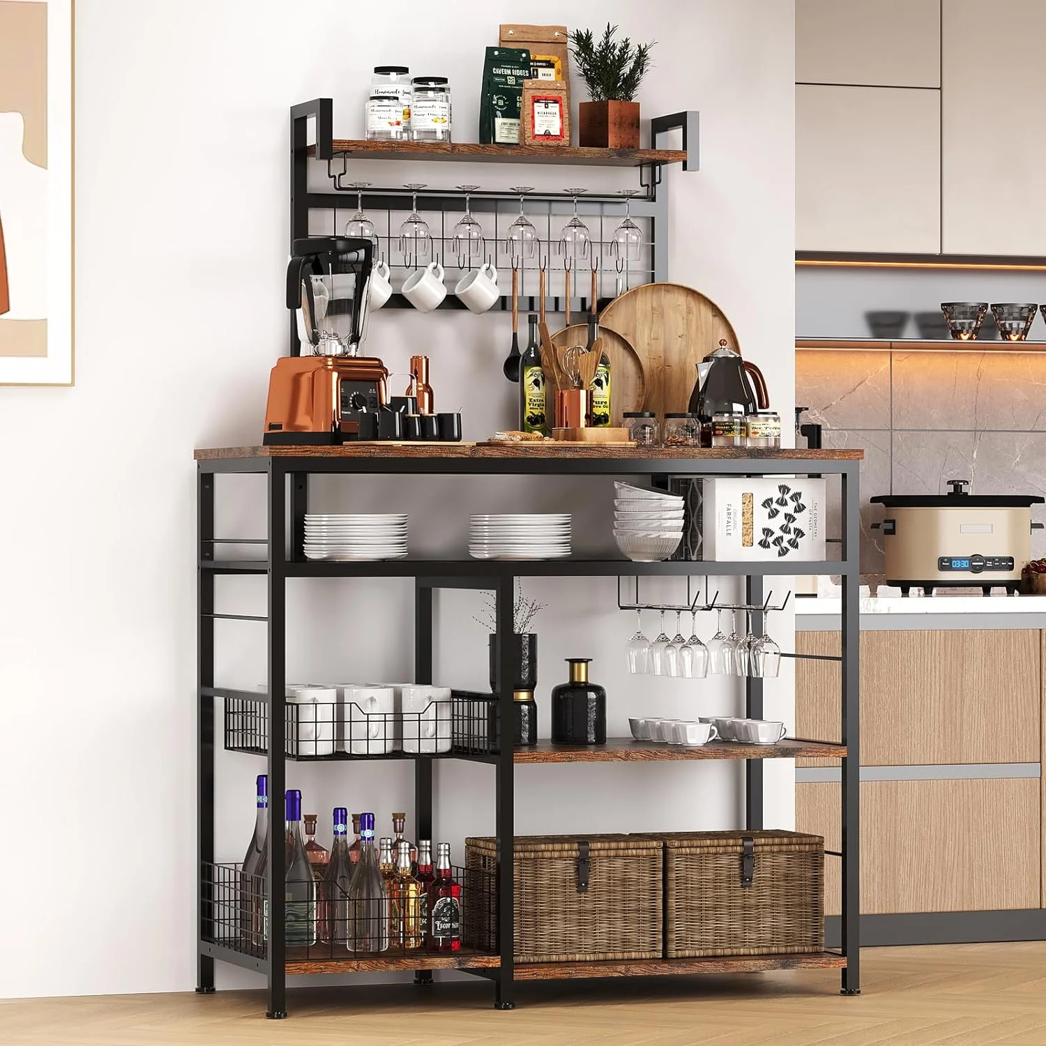 $73.52Large Bakers Rack,Coffee Bar with Wire Basket Microwave Stand Kitchen Storage Shelf for Spices, Pots, and Pans Our 5-tier design allows for easy categorization and access to your kitchen essentials. With a spacious tabletop, sliding storage basket, and open storage compartment, this coffee bar provides ample space to store coffee machines, coffee grinders, tea brewers, water dispensers, and coffee accessories, creating an ideal coffee bar area. Made of MDF board and metal elements, this coffee bar is easy to clean. With height of 60 inch suitable for most household needs,can be used flexibly as a wine rack, microwave stand, bakers rack,or kitchen food storage cabinet. Can save 80% space for your kitchen. Features: Plenty of Storage Space: A mesh shelf for wine bottle storage; 10 hooks for hanging pots & pans; one mesh shelves & five wood shelves for bins or other tools; sliding storage basket to store fruits or vegetables. Multi-functional Storage Cabinet: Serves as baker’s rack, cooking station, bar or beverage station, garden storage, laundry storage or art display rack. Industrial Design: Rustic brown wood combined with Black metal frame creates a simple but chic look for this wine storage rack. Sturdy & Durable Construction: Quality material and craft contribute to this build-to-last kitchen & pantry storage shelf. Easy to Assemble & Clean: With attached tools and straightforward manual, this rack is easy to put together. Rustic brown appearance easy to fit your home in anywhere. Specifications: Brand: X-cosrack Color: Rustic Brown Product Dimensions: 15.6″D x 31″W x 55.6″H Item Weight: 20 Pounds load capacity: 100 lbs Special Feature: Adjustable Feet, Stain Resistant Room Type: Living Room Kitchen, Dining Room, Office, Balcony, Aisle,Bathroom Suit for who use: Adult,Child Package Included: 1x coffee bar cabinet 1x Accessories 1x Manual