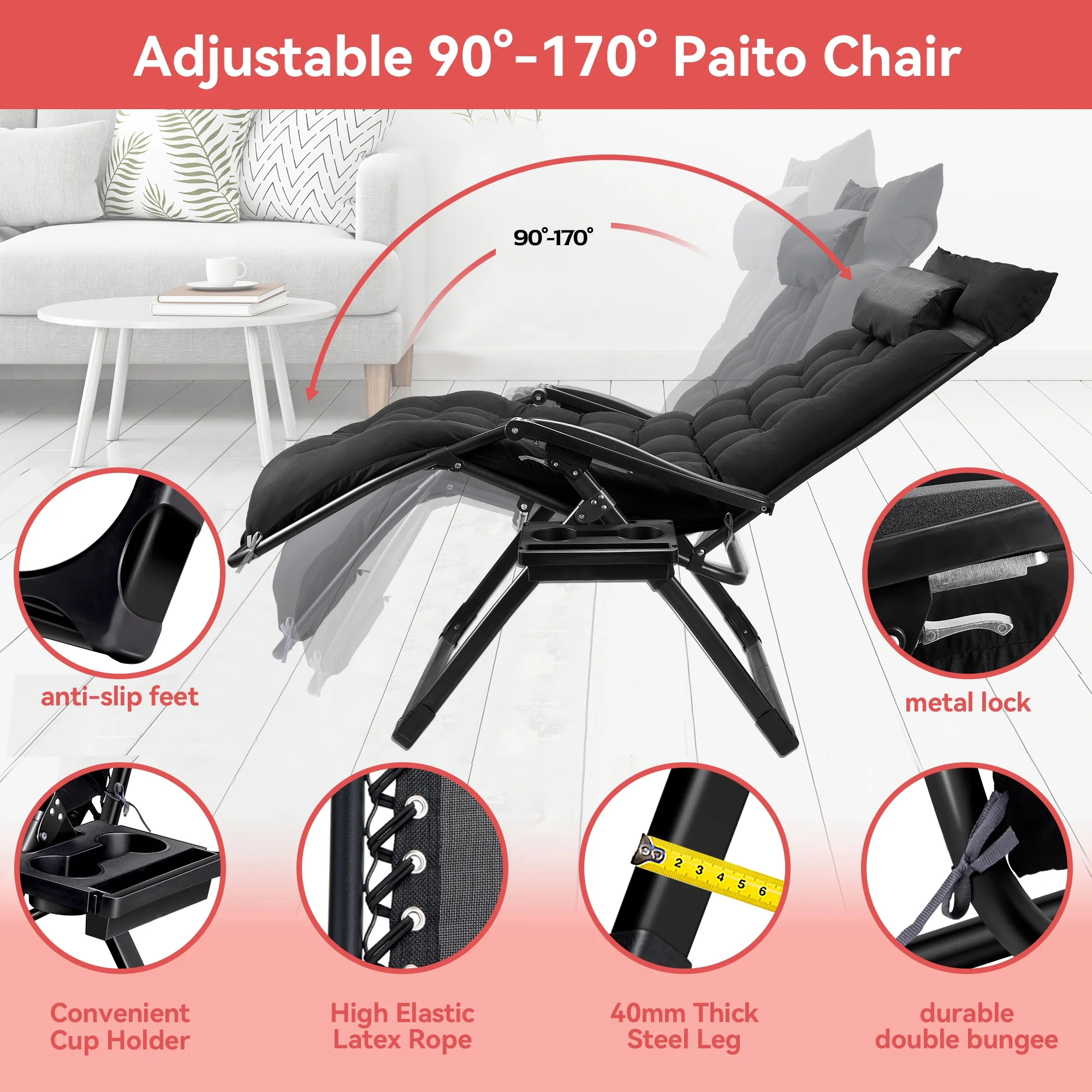 $154.79Original price was: $154.79.$83.41Current price is: $83.41.Reclining Lounge Chair with Removable Cushion & Tray [OVERSIZED XXL SIZE]💺💺💺💺💺💺💺 Set up size is 29″W x 31″D x 45″H, Folding size is 31″W x 33″L x 5.7″H. Cushion Pad is 70″L x 33″W. CHAIR WEIGHT is 22lbs.The WEIGHT CAPACITY is 500lbs. [LONG-LASTING & DURABLE USE]💺💺💺 The zero gravity chair can take 440-500 pounds of weight. This outdoor patio reclining chair is extra durable and will last you a lifetime. This professional outdoor padded lounge chair is built with premium quality materials, which provide increased durability and resistance. [COMFORTABLE & ERGONOMIC DESIGN]💺 The zero gravity chair is designed to satisfy your ultimate comfort. The armrest of outdoor padded lounge chair is thick and contoured. It will serve you whether sitting or lying, outdoor and indoor. Our folding lounge chair comes with a thick and soft pad, and the ergonomic design of this outdoor recliner chair can relieve pressure on your spine, improve circulation, and reduce muscle tension. [ADJUSTABLE & ZERO-GRAVITY CHAIR]💺💺 Our folding lounge chair has an adjustable design that can be adjusted from 110 to 170-degree angle. This amazing feature of outdoor recliner chair helps you select the optimal angle that brings you to a comfortable, relaxing position. Simply push the clip to unlock the position, and pull the clip back to secure it at your desired position. [WIDELY APPLICATION]💺💺💺💺💺💺💺💺 Whether relaxing by reading a book or getting a quick break, this comfortable outdoor patio reclining chair is your one of the best choice. This padded lounge chair can be used indoors, for outdoor activities, such as family gatherings, BBQs or beach day, or at the office, lawn and yard. [REMOVABLE SOFT PAD]💺💺💺💺💺💺💺 Intuitive design features that this outdoor recliner chair can be used by anybody. You can remove the soft cushion from outdoor patio reclining chair to promote better airflow durin.Whether it’s summer or winter, you deserve it.