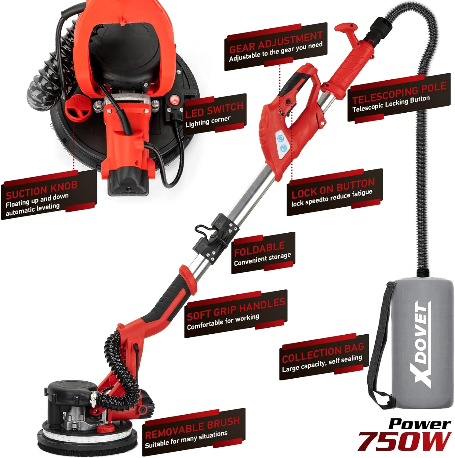 XDOVET Drywall Sander, 750W Electric Sander with 6 Pcs Sanding discs, 6 Variable Speed 800-1750 RPM Wall Sander with Extendable Handle, LED Light, Long Dust Hose, Storage Bag