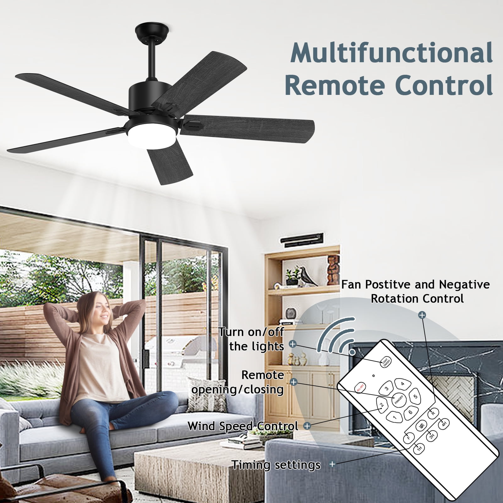XAUJIX Ceiling Fan with Light and Remote Control, 52” Black Ceiling Fan with Light, 6-Speed Reversible DC Motor, 5 Wood Fan Blades