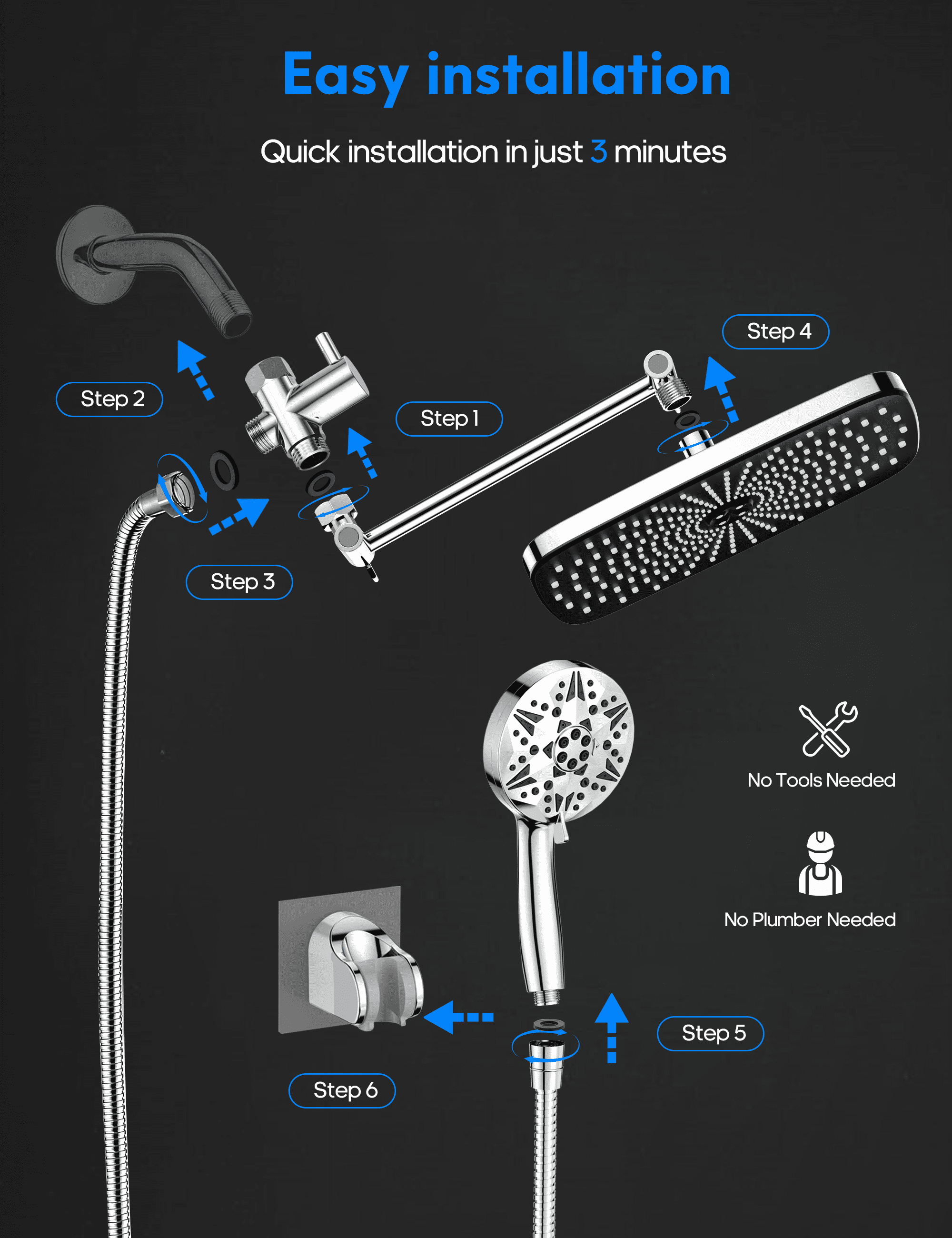 $102.33Original price was: $102.33.$41.27Current price is: $41.27.Upgrade your shower experience with our 12-Inch High-Pressure Rain Shower Head Combo with Extension Arm. Indulge in the wide coverage of a rainfall showerhead, enhanced by 10 versatile handheld spray settings. The adjustable dual showerhead system, featuring anti-clog nozzles, delivers a consistent and invigorating water flow. With a sleek Silver Chrome finish, it adds both style and functionality to your bathroom. **Rainfall Bliss:** Immerse yourself in the calming sensation of a rainfall-style shower. Designed to replicate the soothing feel of natural rain, this shower head provides a relaxing experience that leaves you refreshed and rejuvenated. **Versatile Convenience:** Enjoy the luxury of a fixed overhead shower without giving up the flexibility of a handheld attachment. Rinse and relax from head to toe with our dual shower system. **Handheld Power:** The handheld showerhead, crafted from fully chrome-plated, heat-resistant stainless steel, combines ultra-thin design with air intake technology to deliver a powerful, high-pressure spray. It’s like a dynamic full-body massage for your skin, optimized for any water pressure.