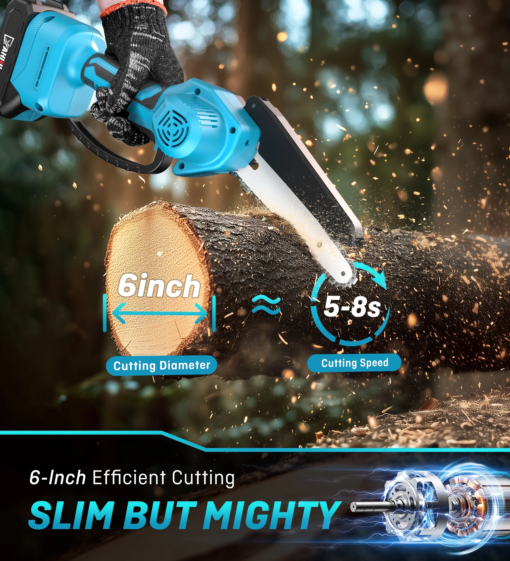 YAHHU 6 Inch Mini Cordless Chainsaw, Handheld Electric Chain Saw with 2 Batteries and 2 Chains for Tree Trimming and Wood Cutting
