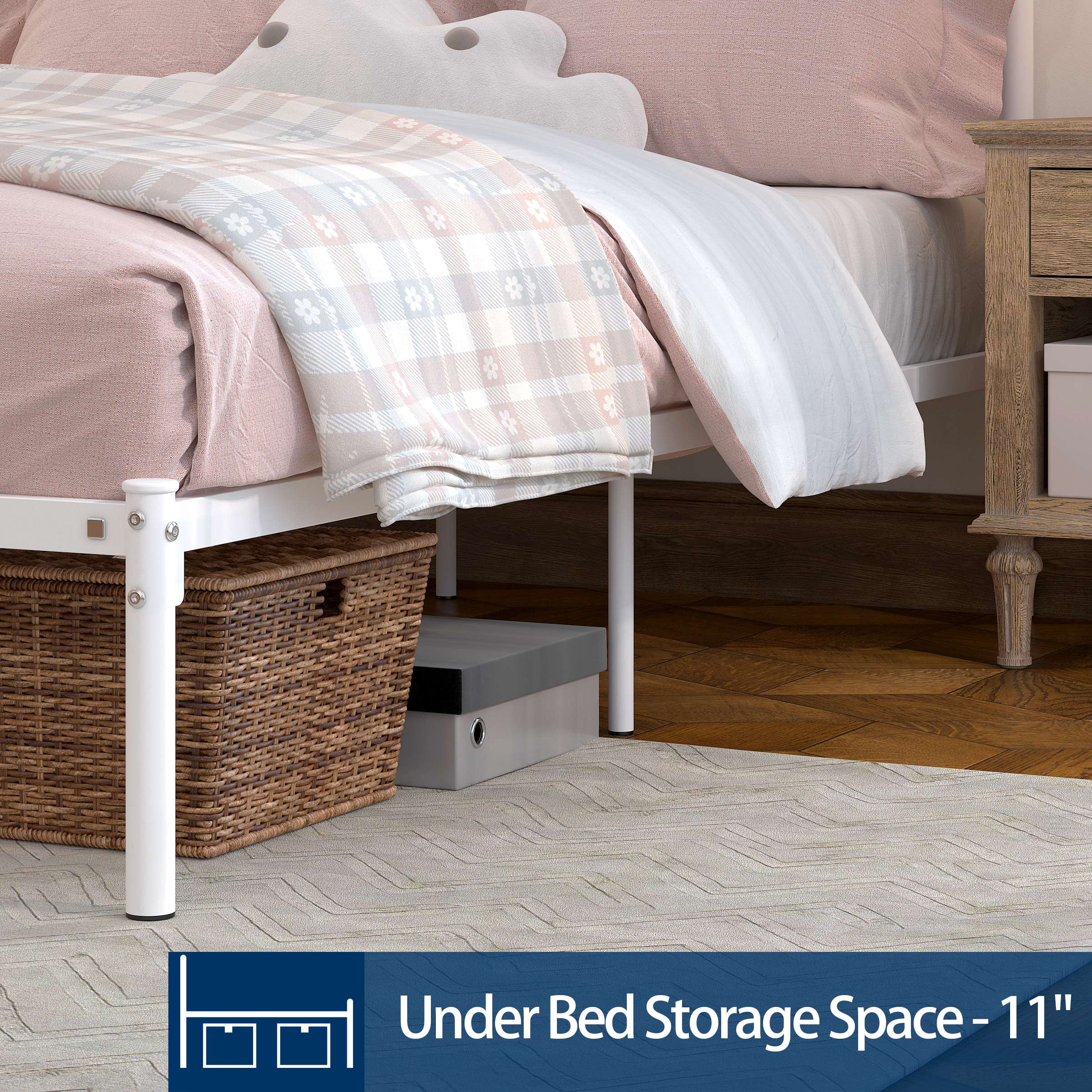 $66.22Yoneston Easy Set-up Premium Metal Bed Frame Platform Mattress Foundation with Headboard, Under-bed Storage, Multiple Size. This metal Adult bed frame foundation is made from durable, premium quality steel to provide sturdy support for your mattress. It is a unique, easy-to-assemble sturdily construction system that will provide you with reliable and convenient bedding support. The 12.5″ height allows the mattress to breathe, as well as save space by storing underneath.