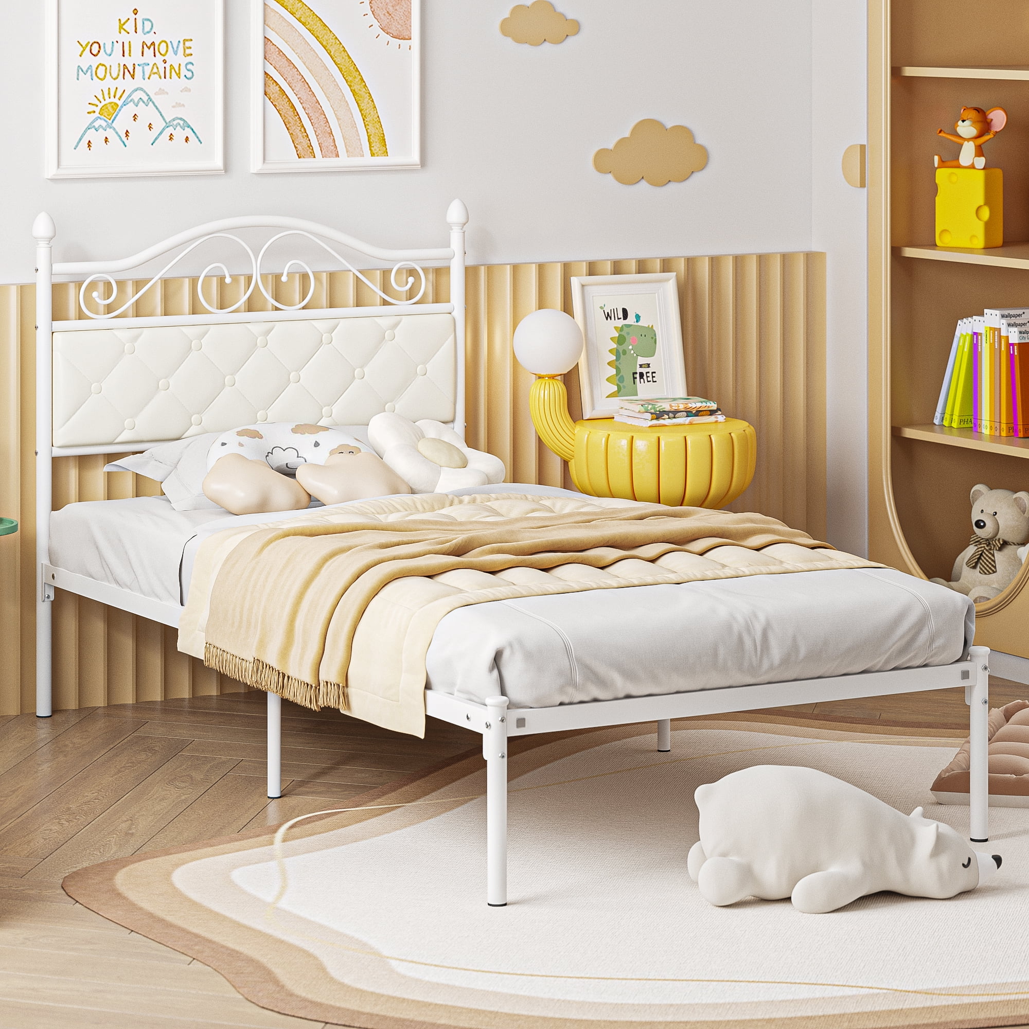Yoneston Easy Set-up Kids Metal Bed Frame Platform Mattress Foundation with Headboard for Girls, Twin, White