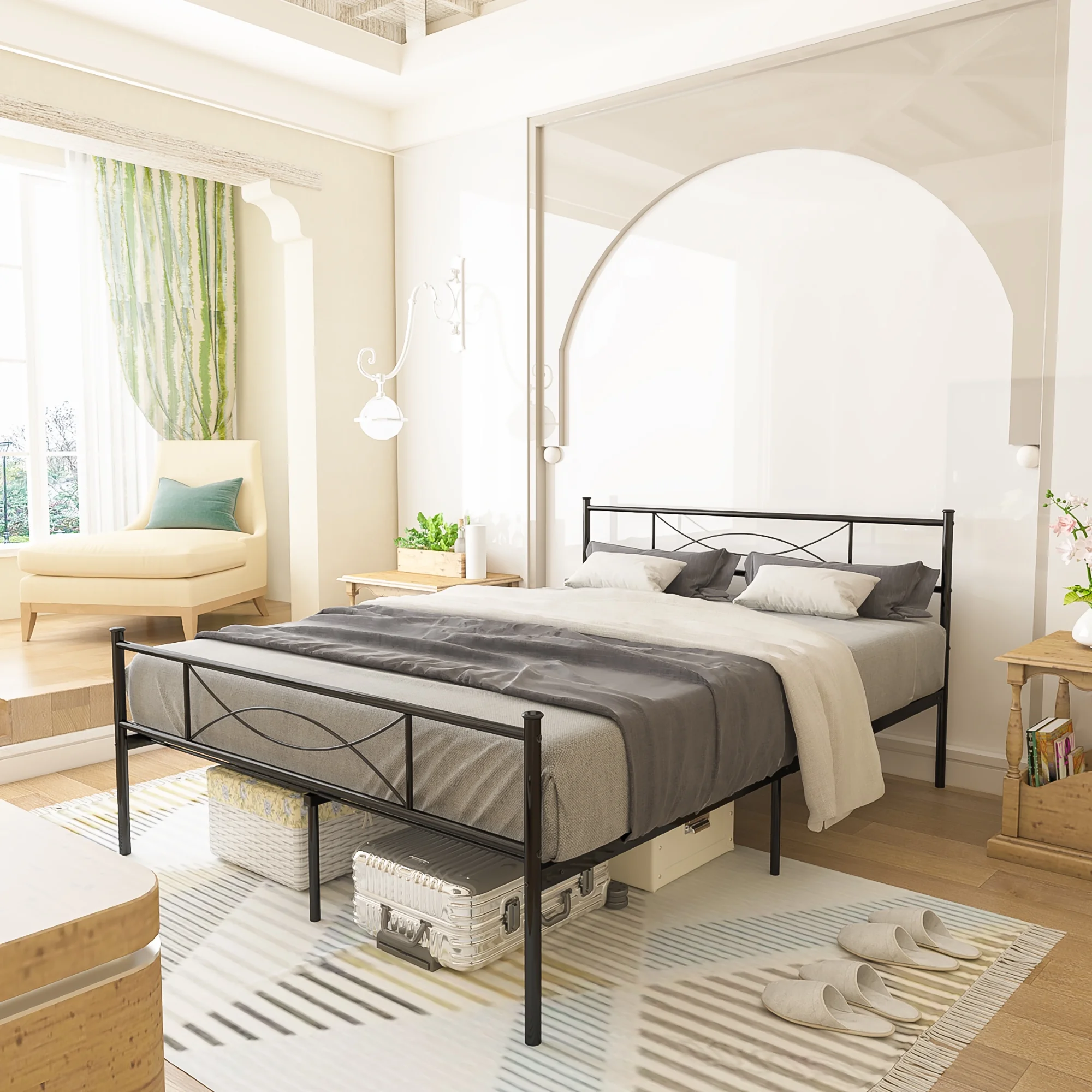 $98.90This bed frame features a vintage arched design combined with practical use, modern iron, beautiful lines suitable for a variety of bedroom decor. Made from metal and features dowel feet with understated side rails and footboards for a low-profile design, and it come with a slat kit, no need a box spring when you used. The bed frame adopts a sturdy square steel tube frame provides strong support .The space under the bed can be used as storage space, effectively improving the utilization ratio of space. Classic design brings a warm and elegant feeling to your cozy home.