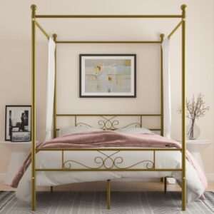 Yoneston 4-Post Metal Canopy Bed Frame Strong Metal Slat Support Mattress Foundation, Full, Gold