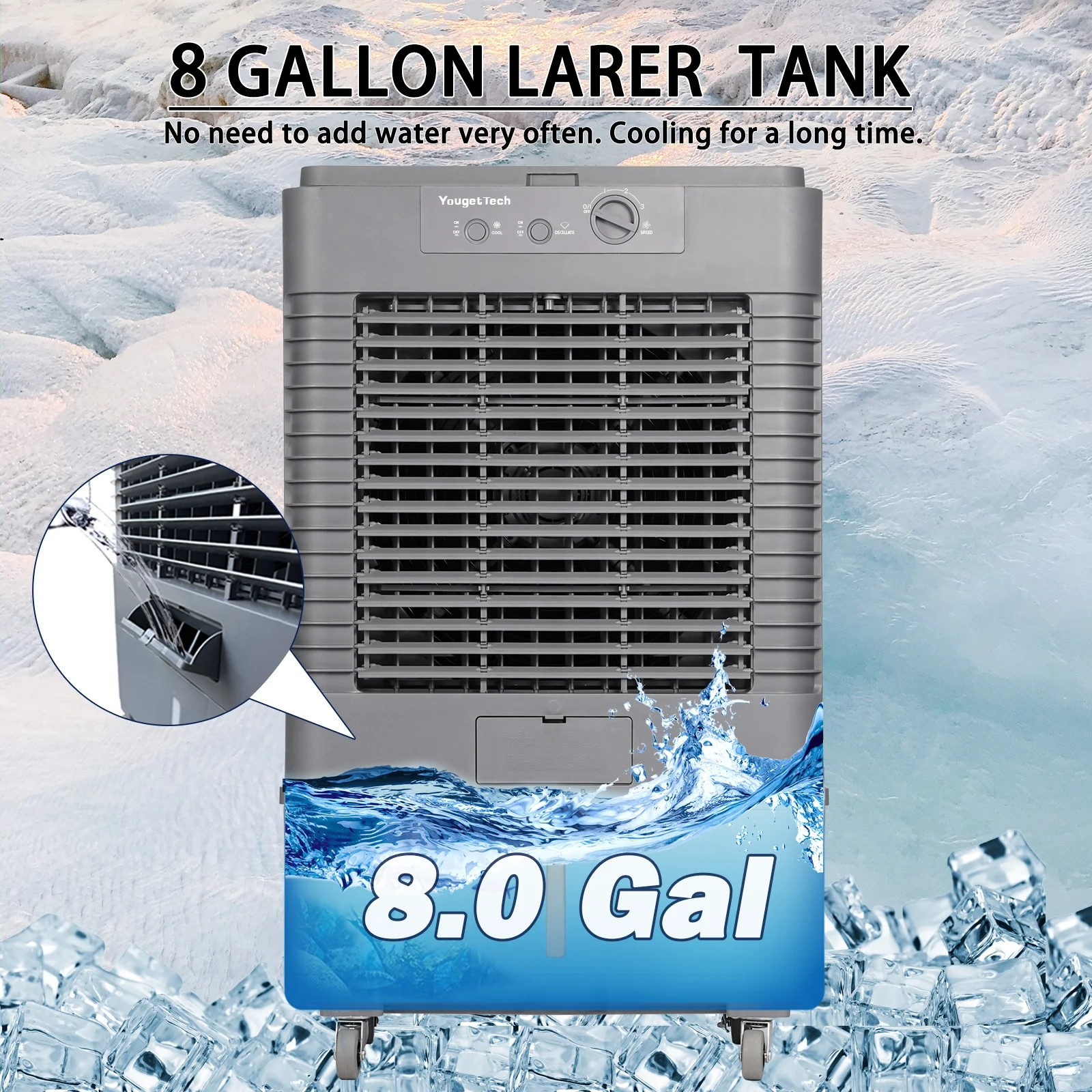 $257.99Original price was: $257.99.$206.39Current price is: $206.39.【LARGE COVERAGE AREA, 3000CFM AIR VOLUME】 It’s a 3-in-1 portable cooling fan that blows, humidifies, and cools the air. With its 90 ° horizontal oscillation and 90 ° vertical oscillation, the Evaporative Air Cooler can expel 3000 cubic feet of cold air per minute and distribute it to up to 720 square feet space. This would be an excellent alternative to air conditioners. 【30L/8GAL LARGE TANK & AUTOMATIC REFILLING】 Featuring a large 8-gallon water tank that can keep the cooler working for 5-8 hours. The water level indicator helps you monitor the water usage. You can manually add water from the water inlet or connect the garden hose to refill automatically. 【4 ROLLING CASTERS for MAX MOBILITY】YougetTech Evaporative Air Cooler features 4 heavy-duty 360-degree wheels (2 with brakes,2 without brakes). The universal wheel, dust proof bag, copper interface, and other components are placed in the top tool box. There are flexible handles on both sides of the cooler, you can move it to any space. 【ENERGY-SAVING & ECO-FRIENDLY COOLING】The evaporative air cooler doesn’t have a compressor and doesn’t add refrigerant, which not only saves energy but also protects the environment. The three-sided 3D honeycomb cooling pad offers enhanced cooling performance compared to other Cellulose cooling pads, is more absorbent and permeable, and is easy to maintain. The rated power is 160W. 【EASY to OPERATE】The built-in mechanical control only have three buttons: speed (High, Med, Low), pump (On, Off) and oscillation(On, Off). It’s easy to operate. This Air cooler offers you the most reliable performance.