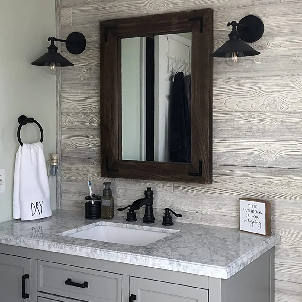 $60.19This is rustic wood vanity mirror,It fits perfectly into your interior. This mirror is set within a wooden frame in a distressed brown for a dash of rustic character. The mirror is an excellent addition to the interiors of the bedroom, living room, entrance hall, bathroom. Decorate the rooms to your taste and admire your reflection at any convenient time!