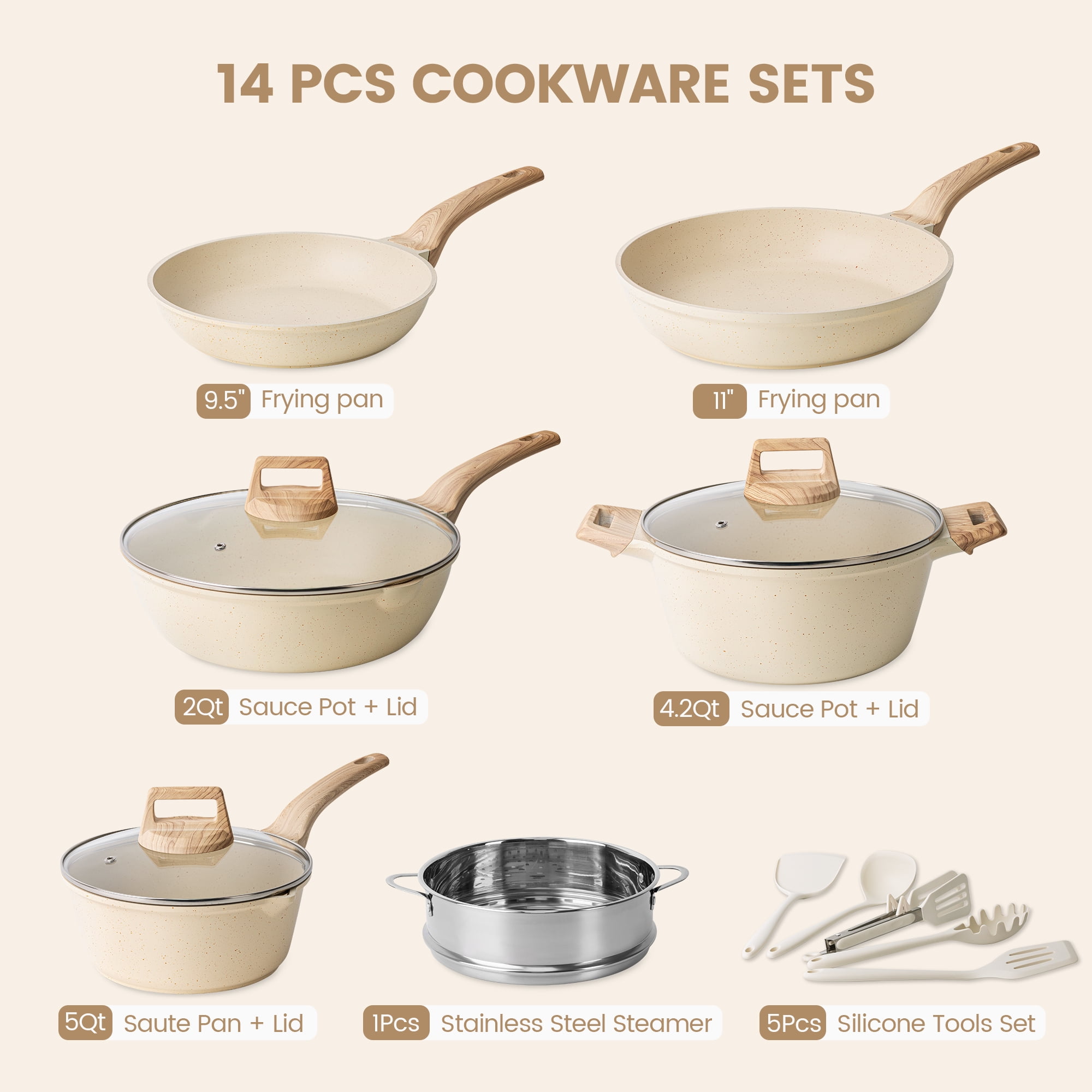 Younghome 14 Pcs Nonstick Pots and Pans Cookware Set, Kitchen Cooking Sets Easy Clean, Beige Granite