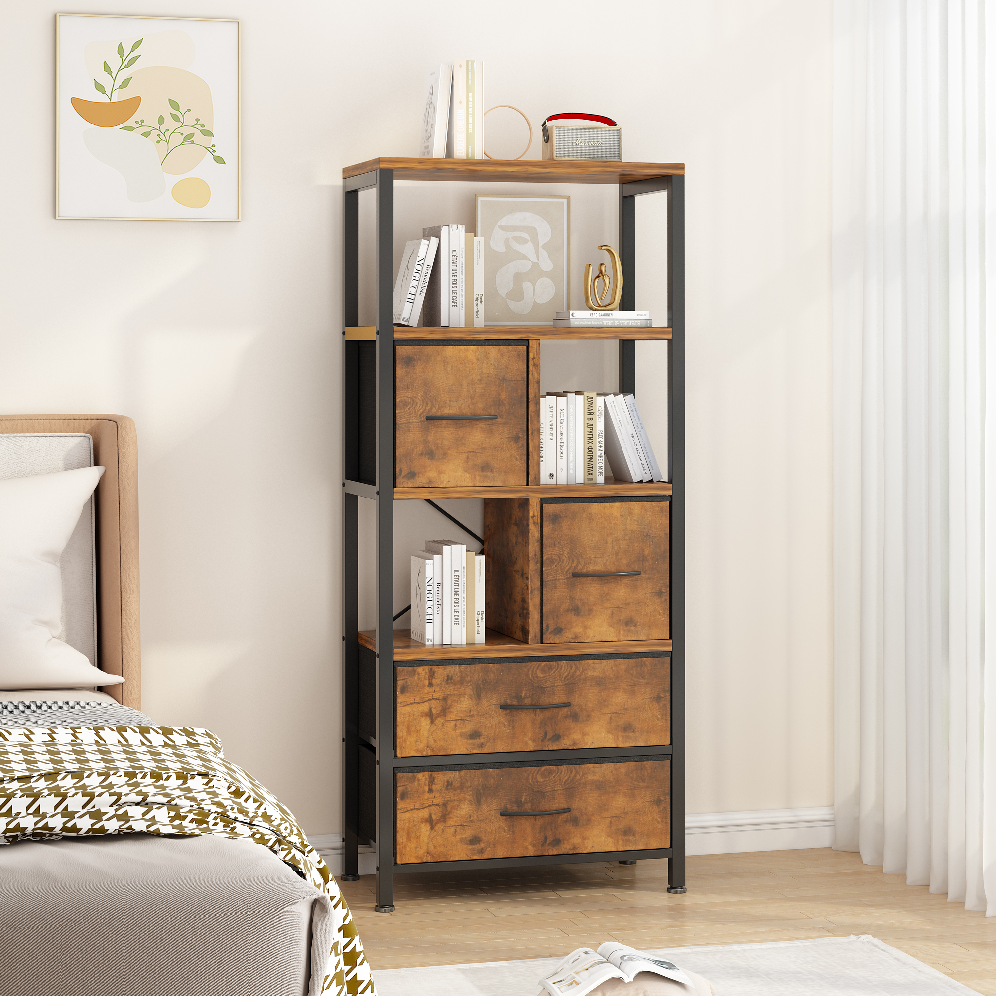 Zimtown 5-tier Iron Bookcase with 4 Drawers, Free Standing Bookshelf Storage Organizer Display shelf with Metal Frame, Brown