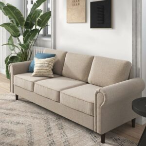 Zinus Maddon 35″ Upholstered Platform Bed Frame, Beige, Adult, Queen