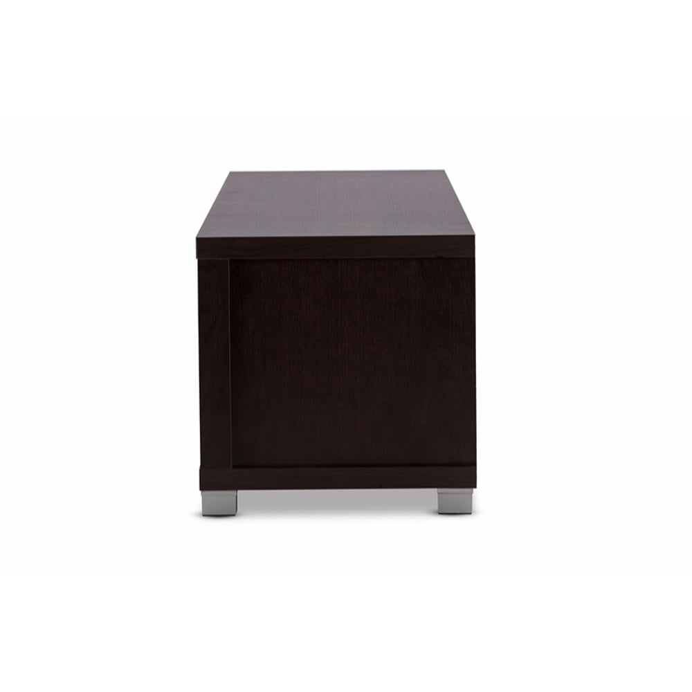 $111.79Baxton Studio Gerhardine Dark Brown Wood 63-Inch TV Cabinet with 3-drawer This sleek contemporary media console will be a sophisticated addition to your living room. The long low piece features clean lines, in a rich dark espresso finish that will complement your decor. The generous top surface will accommodate a large television up to 75 inches flat screen TVs , while open compartments below are ideal for electronics components. The large lower drawers and shelves offer lots of enclosed storage, great for movies, gaming equipment, and other media items that you want to keep hidden. The combination of MDF and frosted glass decoration accent the drawer front for a cool modern look that you will love. Create a chic look in your living room with this stylish contemporary TV stand. Specifications: Materials: Engineered wood and MDF Finishing: Espresso PU veneer finishing Frosted glass on the drawer front/door front
