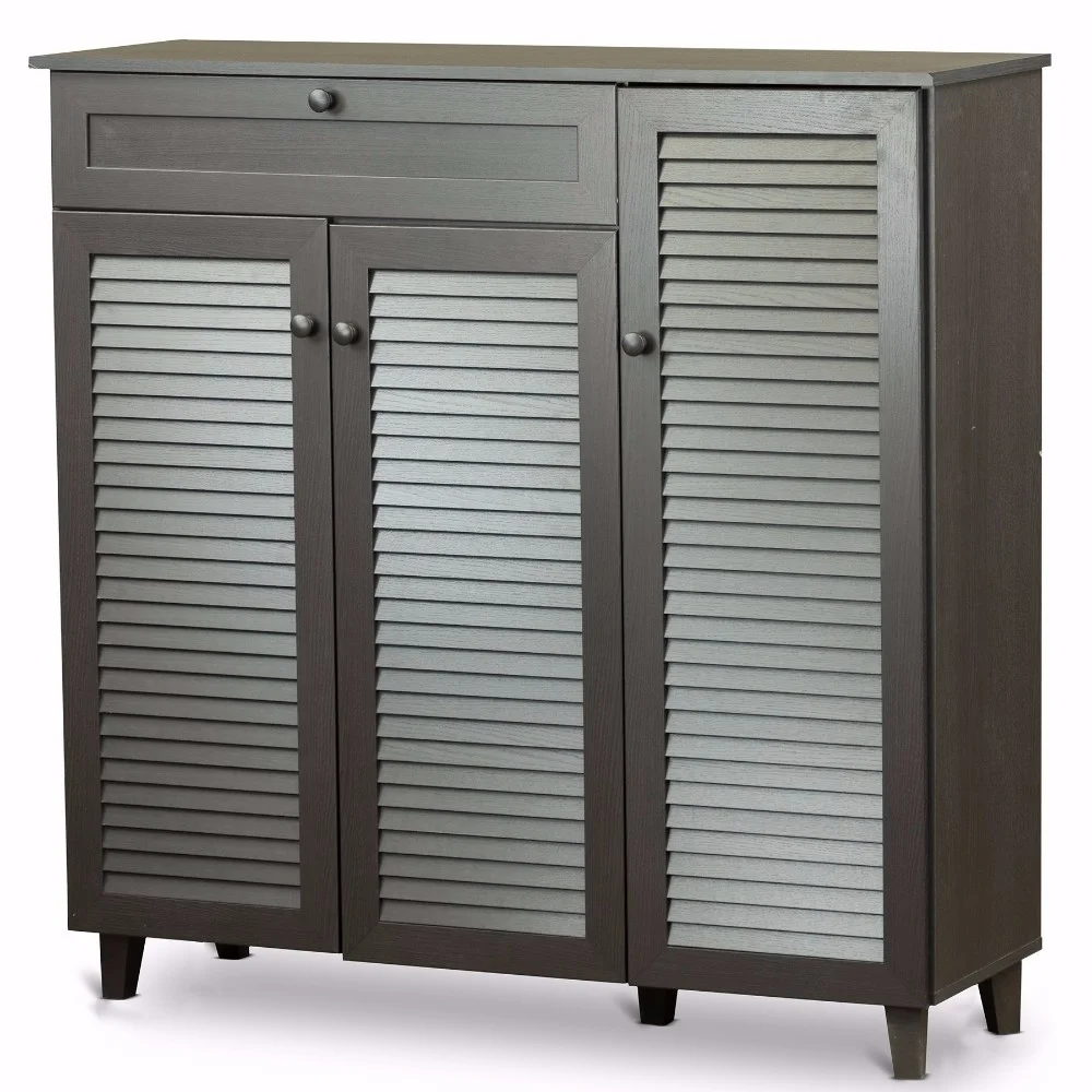 $185.75Baxton Studio Pocillo Wood Shoe Storage Cabinet Storage and style. Our Pocillo Wood Shoe Storage Cabinet offers plenty of places to stow footwear without forsaking fashion. This contemporary shoe-storage cabinet can be placed just about anywhere in your home thanks to its dark-brown finish and attractive wood frame. Three hinged front doors feature solid wood handles. Specifications: Contemporary shoe storage cabinet Three hinged front doors with Solid wood handles Five (5) fixed-height shelves for shoe storage and top drawer provide extra storage