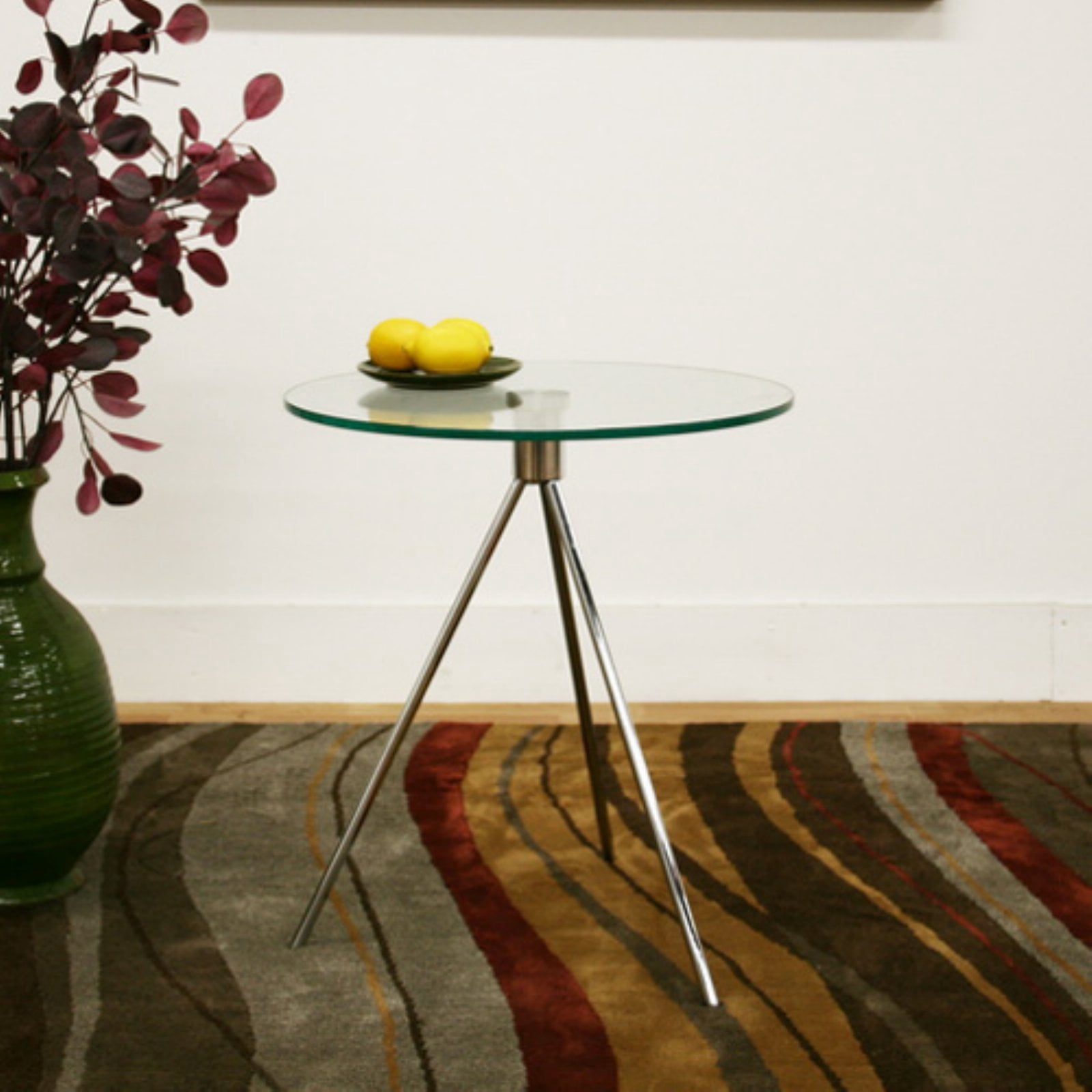 $46.65This sleek modern end table makes it a point to provide a simple yet elegant place to rest beverages or add decorative accents to complete any living room set. The round tabletop is made of tempered glass and sits on a very sturdy tripod base made of steel with a brushed finish. Small black plastic non-marking feet are included, and some simple assembly is required. Features: Finish: clear and brushed nickel Made of steel Modern style Steel tripod base Black plastic non-marking feet Product Weight: 15lbs Specifications: Product Dimensions: 22.25″ H x 19.75″ W x 19.75″ D