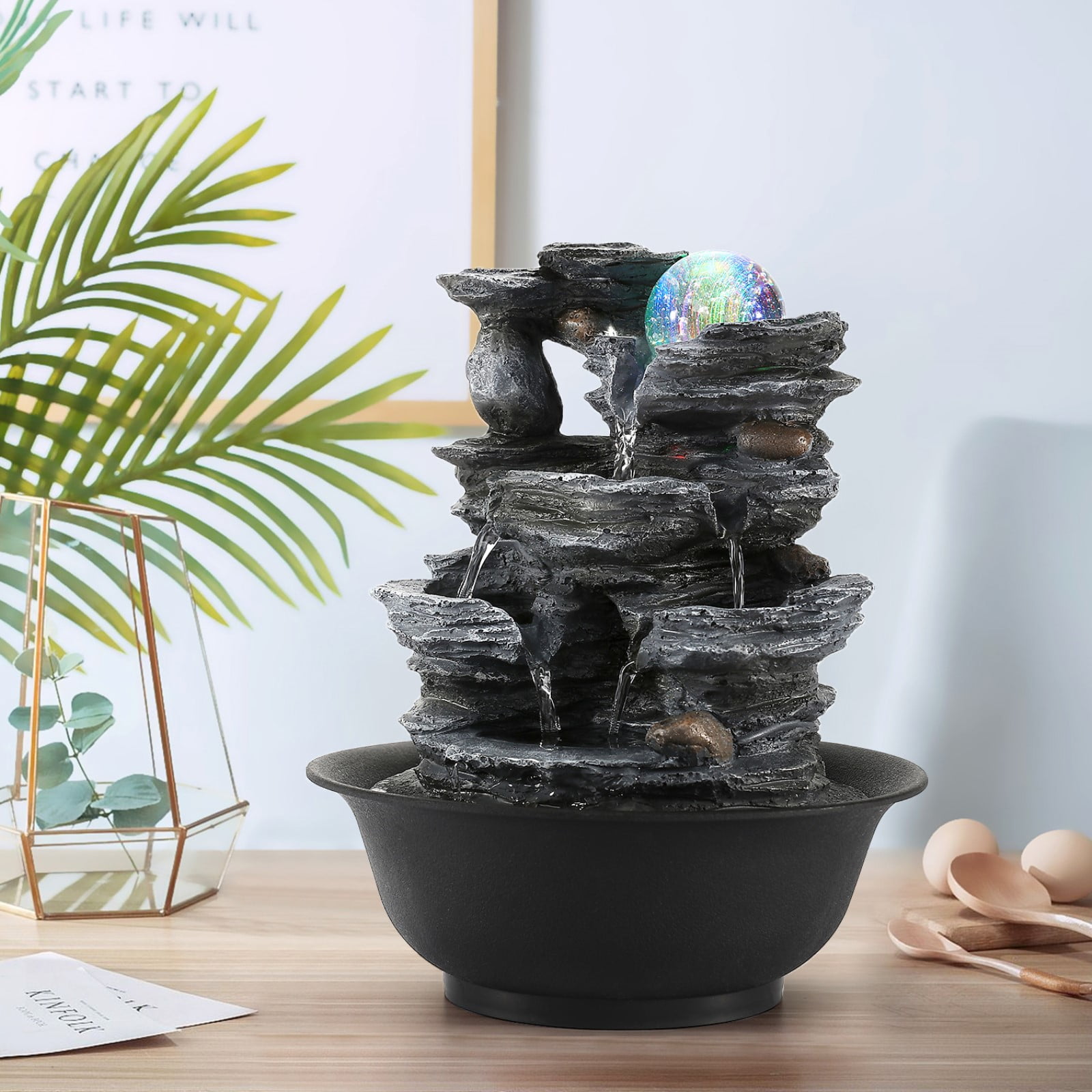 BEAMNOVA 10.2″H Tabletop Water Fountain with Rolling Ball & LED Light, Indoor Resin Rockery Waterfall Fountain Decor