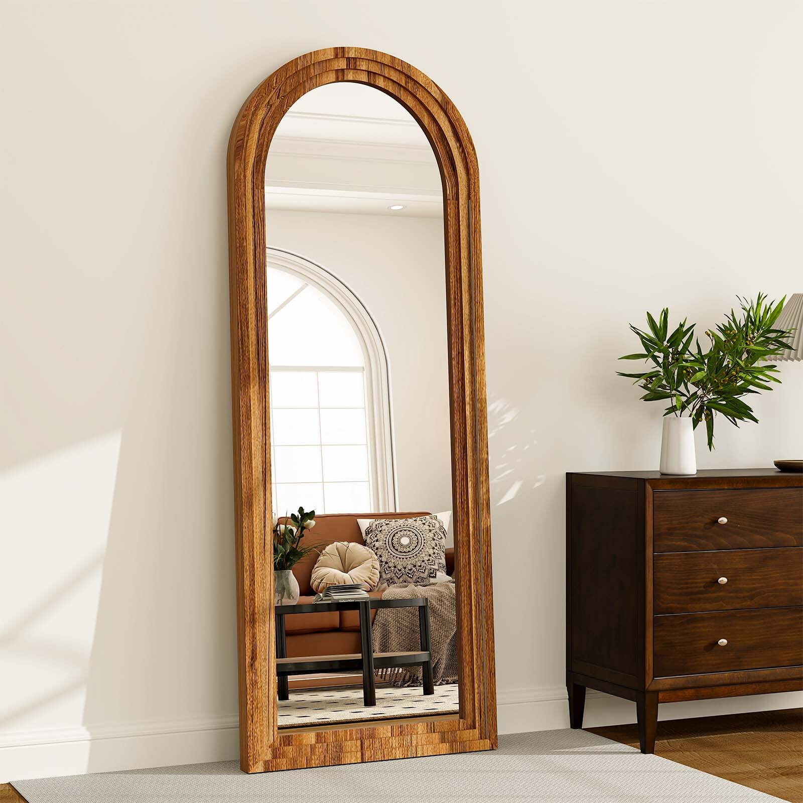 BEAUTYPEAK 21″x 64″ Classic Paulownia Wood Framed Arched Full Length Mirror, Brown