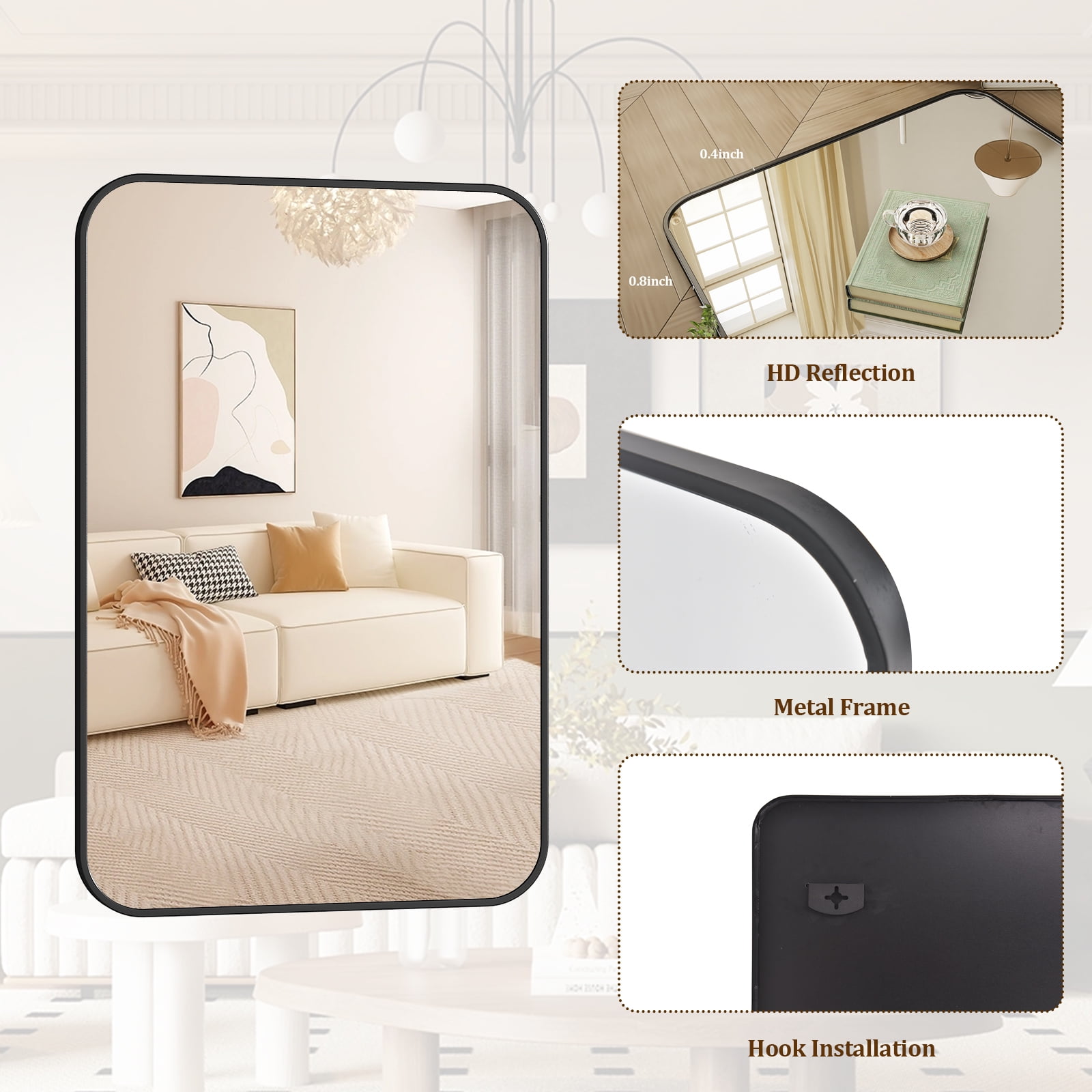 BEAUTYPEAK 24″x36″ Wall Mirror Rounded Corners Hanging Vanity Mirror Black