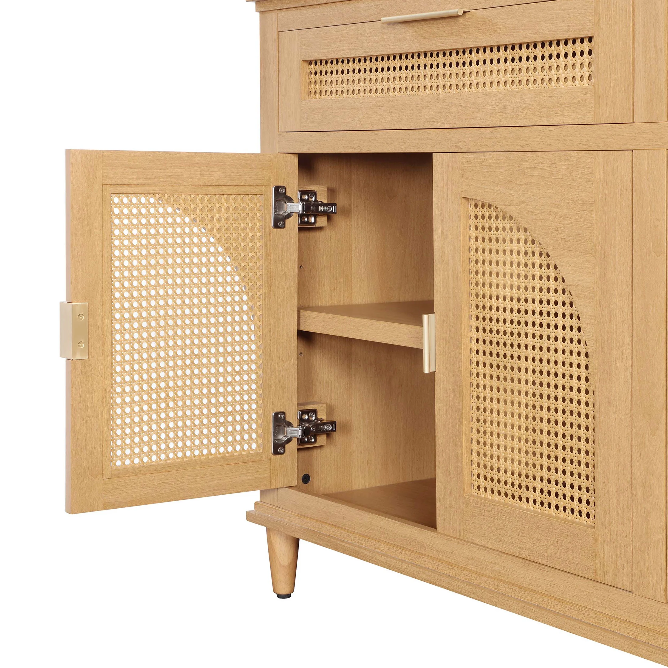 $205.54Original price was: $205.54.$184.90Current price is: $184.90.Transform your space with the Beautiful Drew 4-Door Buffet Cabinet. Crafted from solid wood and available in warm honey or rich black finishes, this dining cabinet is designed to elevate your dining room, hallway, or living room. The contemporary style, featuring rattan mesh cabinet door fronts and gold-painted metal hardware, seamlessly blends elegance and functionality. With four spacious cabinets and adjustable shelves, it provides ample storage for your dinnerware, linens, or even media components. The cable cutaways ensure a clean, organized look for electronics. Whether you’re a homeowner or an apartment renter, this versatile piece promises to be a stylish and practical addition to your home. Make a statement with furniture that offers both beauty and utility. Pair the Drew Rattan 4-Door Buffet with other items from the Beautiful by Drew Barrymore Furniture collection to complete your living or dining room (sold separately).